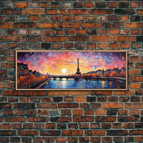Eiffel Tower Abstract Paris France Panoramic Framed Canvas Print, Van Gogh Inspired Original Painting, Colorful Wall Art