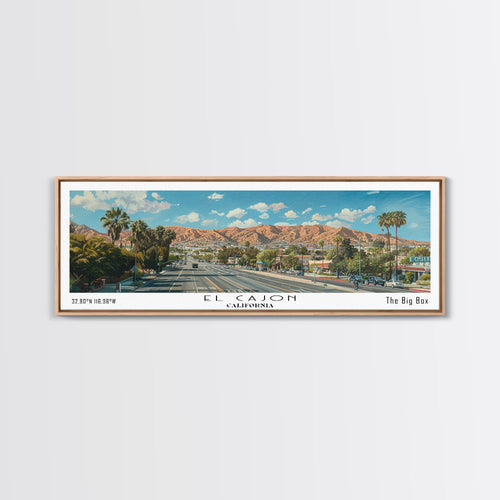 El Cajon California Panoramic Wall Art, Mid Century Modern Framed Canvas Print, Retro Pop Art Travel Poster, City Home Decor, Office Art