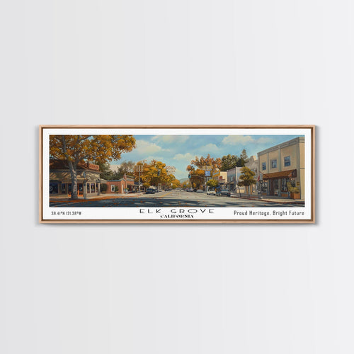 Elk Grove California Panoramic Painting, Framed Canvas Print, Mid Century Modern Wall Art, Retro Pop Art Travel Poster, Office Decor, City Art