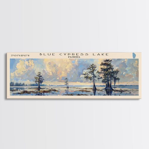 Blue Cypress Lake Florida Framed Canvas Print, Panoramic Wall Art, Midcentury Modern, Pop Art, Travel Poster, Scenic Living Room Art, Lake House Decor