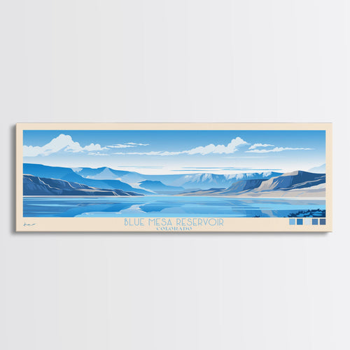 Blue Mesa Reservoir Colorado Framed Canvas Print, Panoramic Travel Poster, Midcentury Modern Wall Art, Pop Art, Nature Bedroom Decor, Scenic Lake House Art