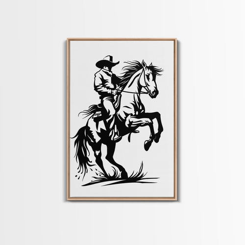 Dynamic Cowboy on Rearing Horse - Framed Canvas Print, Western Wall Art, Rustic Decor, Living Room and Bedroom Art Print