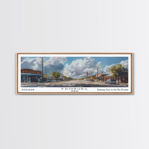 • Edinburg Texas Panoramic Wall Art, Mid Century Modern Framed Canvas Print, Retro Pop Art Travel Poster, City Office Art, Living Room Decor