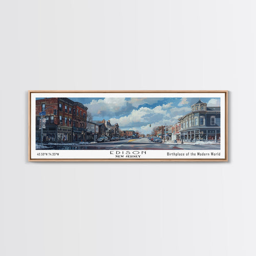 • Edison New Jersey Panoramic Painting, Mid Century Modern Framed Canvas Print, Retro Pop Art Travel Poster, City Wall Decor, Home Decor