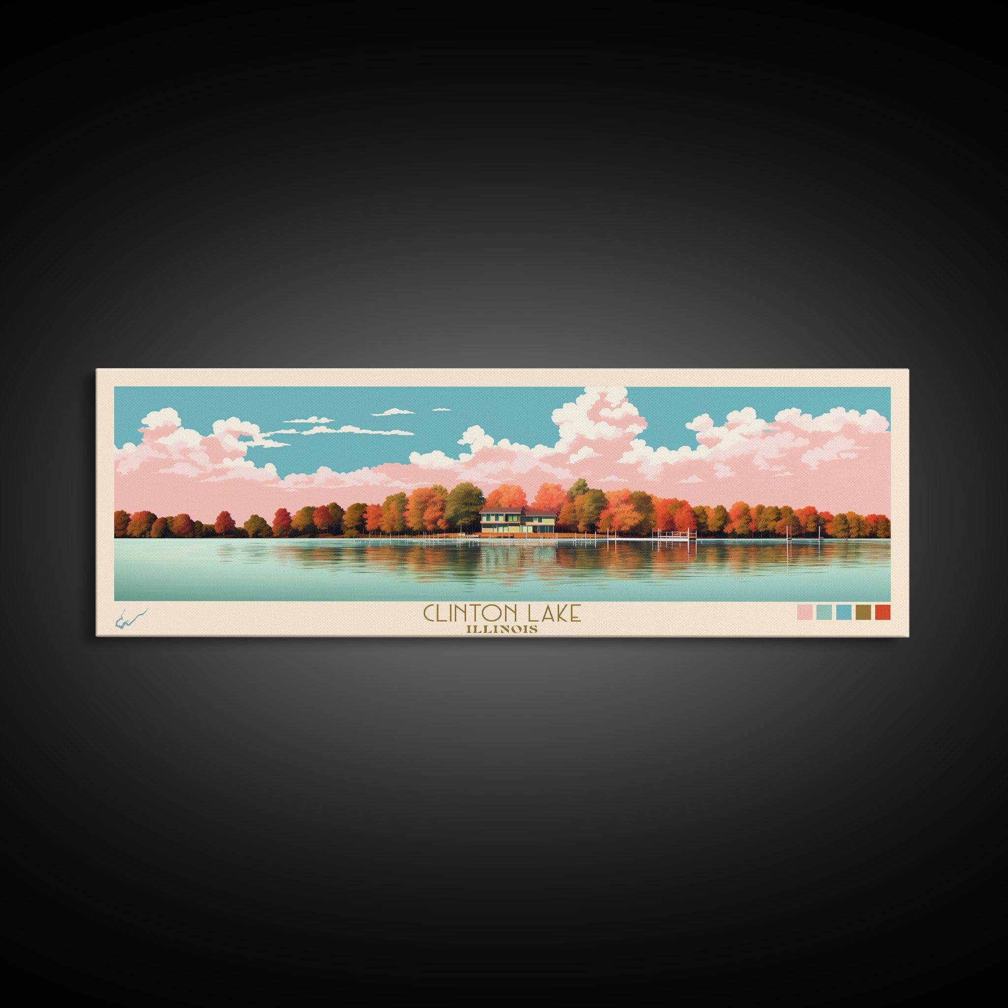 Clinton Lake Illinois Framed Canvas Print, Midcentury Modern Panoramic Wall Art, Living Room Decor, Pop Art, Travel Poster Art, Scenic Nature Painting, Lake House Decor