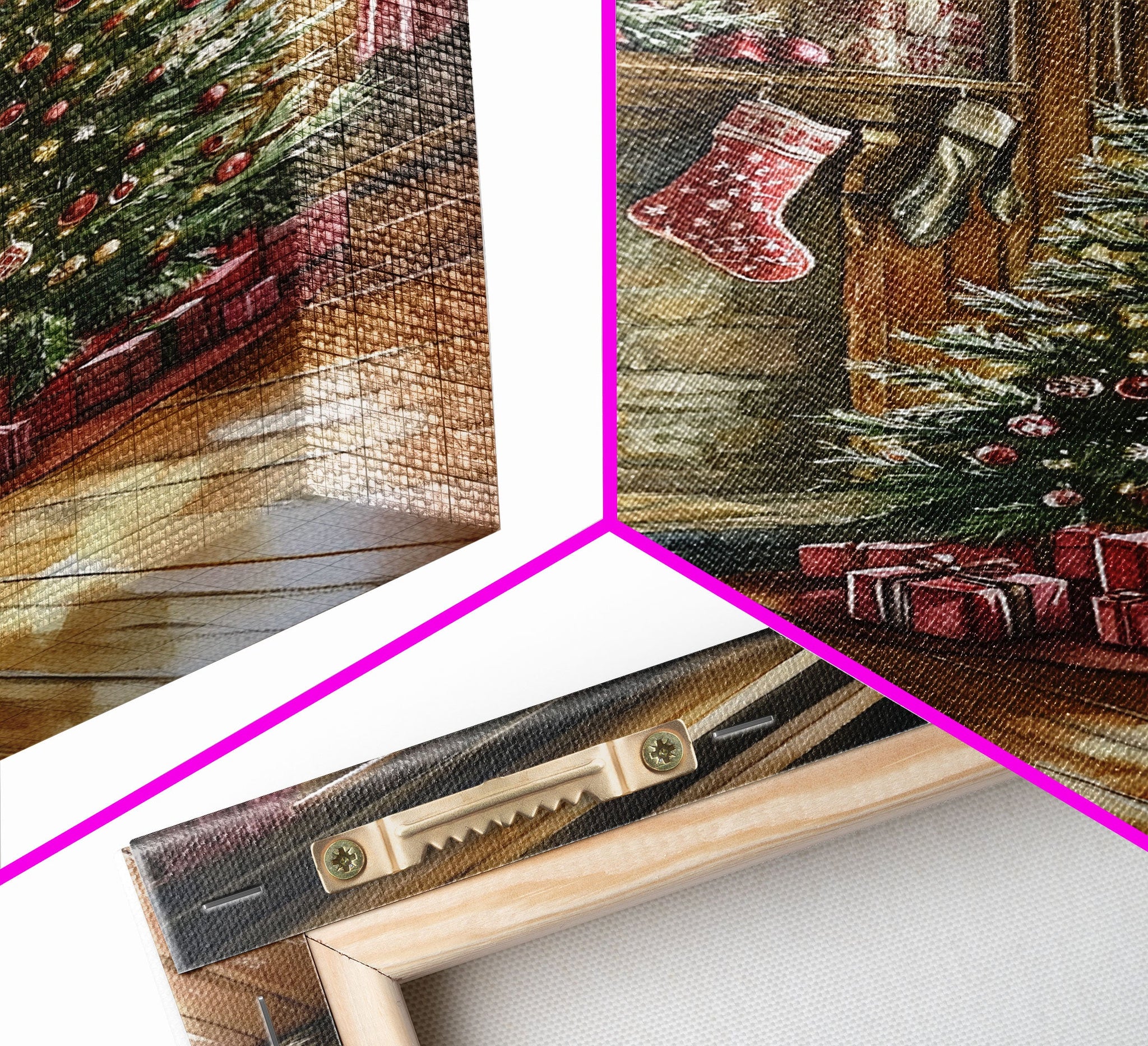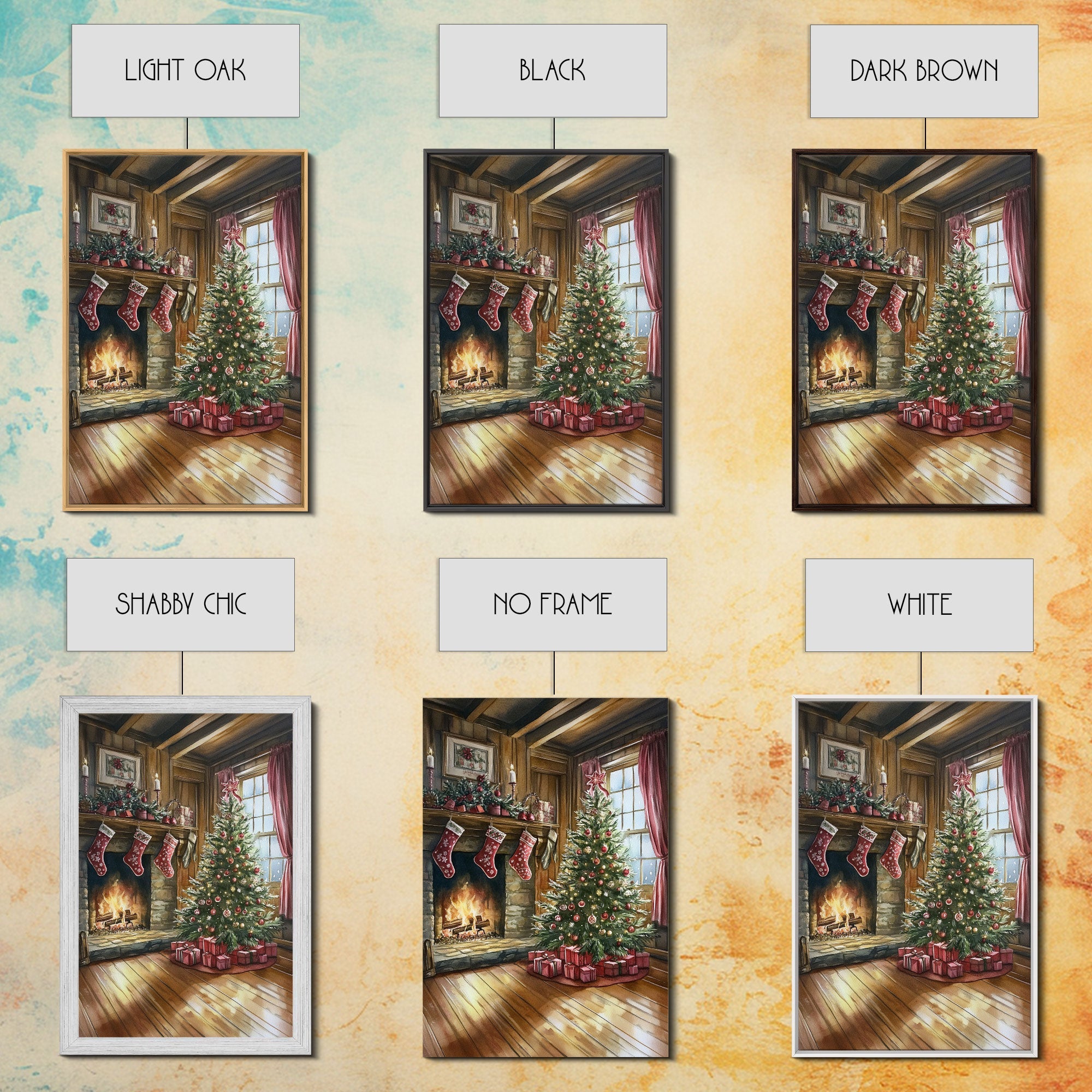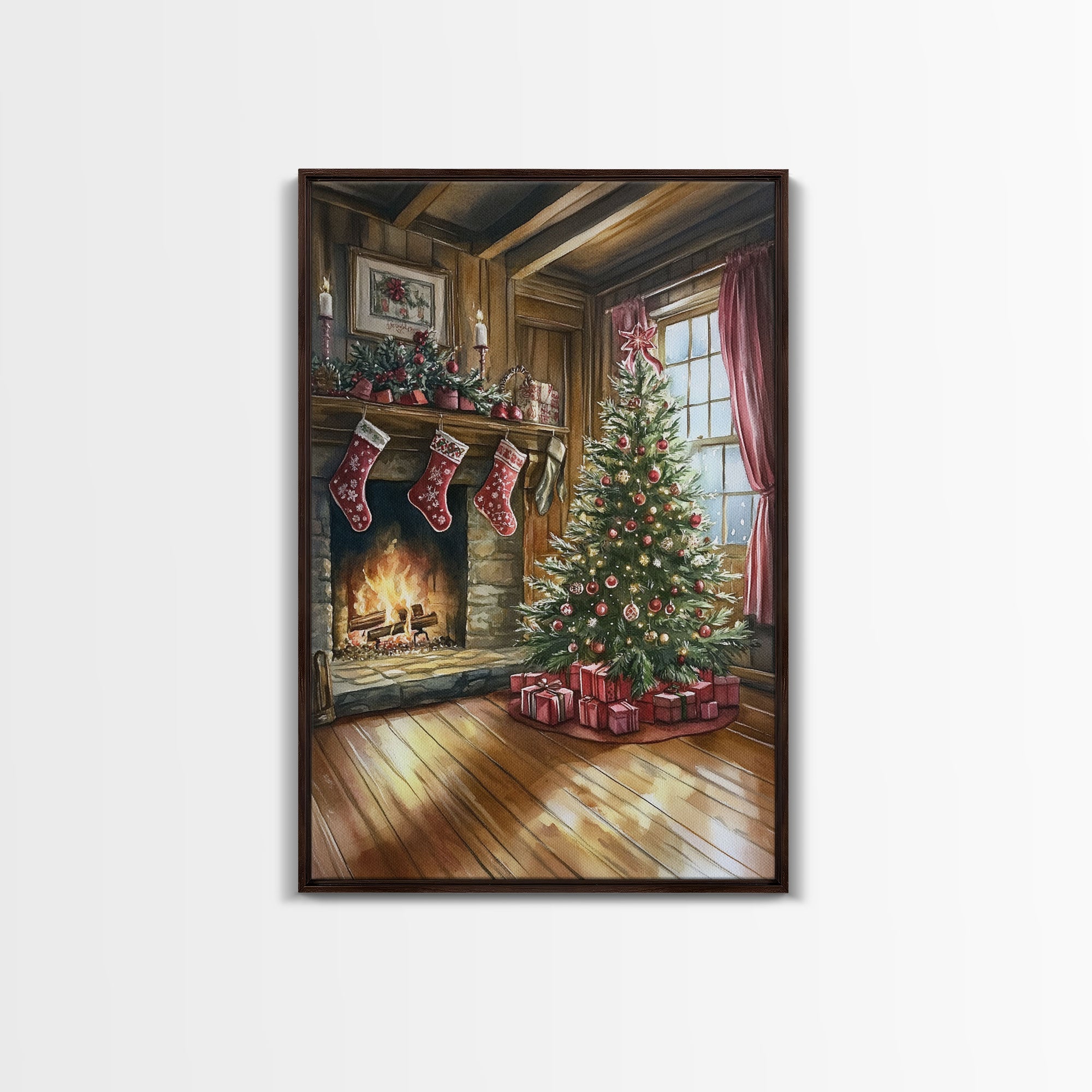 Cozy farmhouse Christmas interior Framed Canvas Print with tree stockings and fireplace, warm holiday art rustic Christmas decor mantle