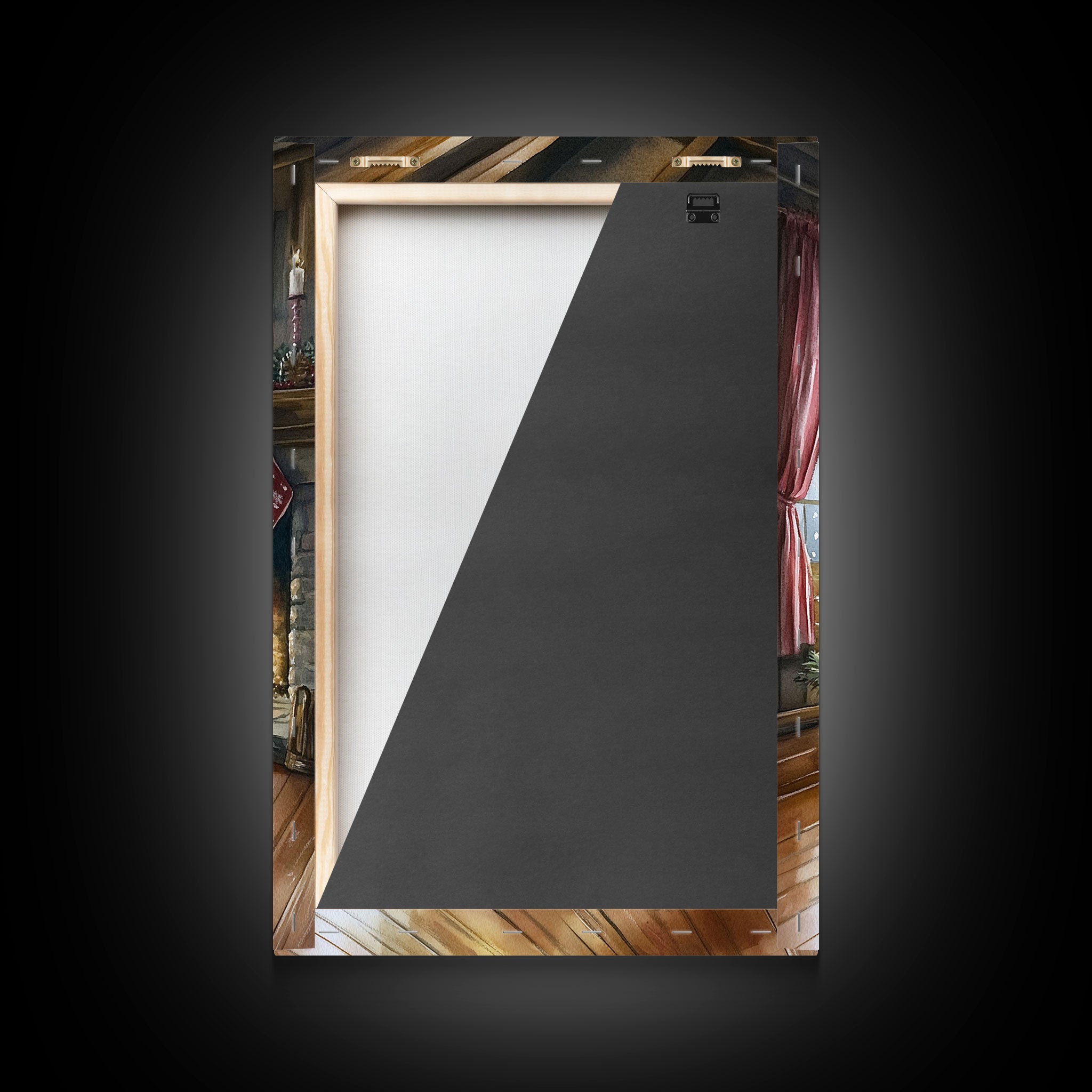 • Load image into Gallery viewer, Cozy farmhouse Christmas interior Framed Canvas Print with tree stockings and fireplace, warm holiday art rustic Christmas decor mantle