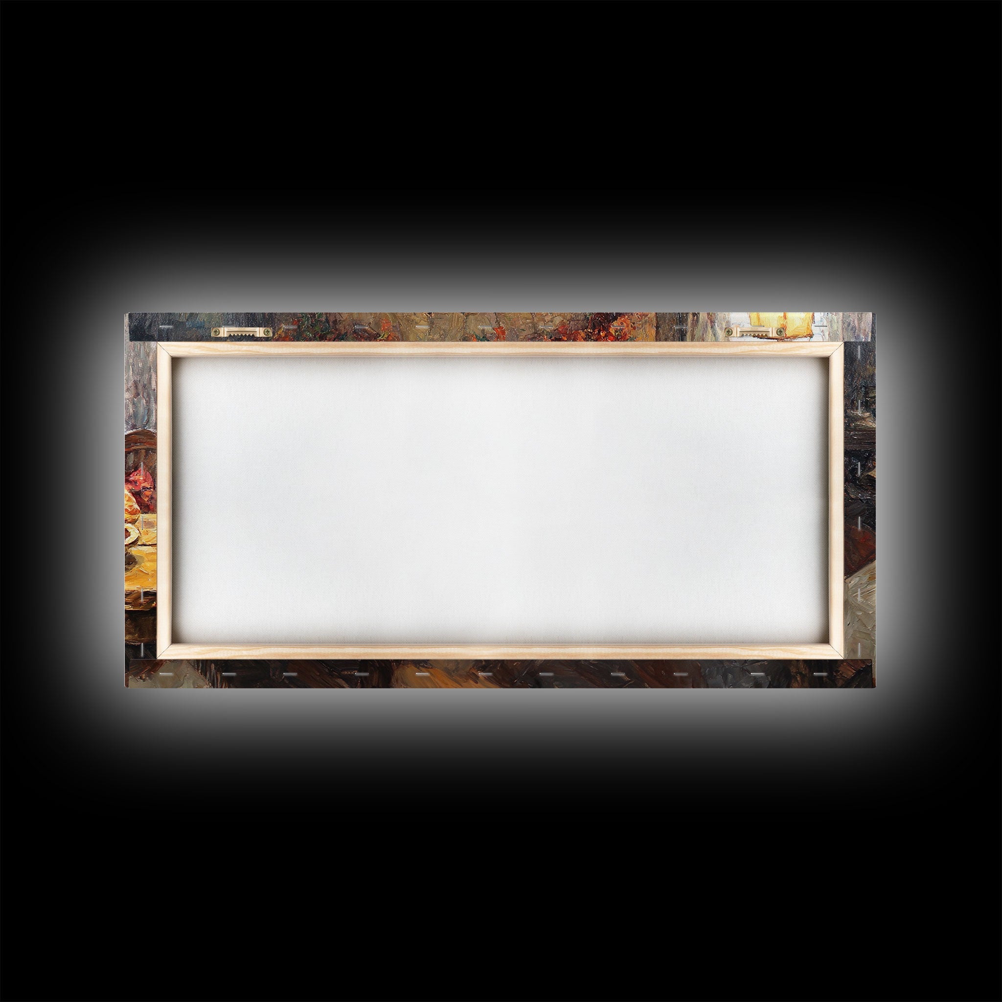 • Load image into Gallery viewer, Cozy Thanksgiving Feast by Fireplace Framed Canvas Print Seasonal Wall Art, Rustic Fall Decor, Harvest Celebration Art Print for Home
