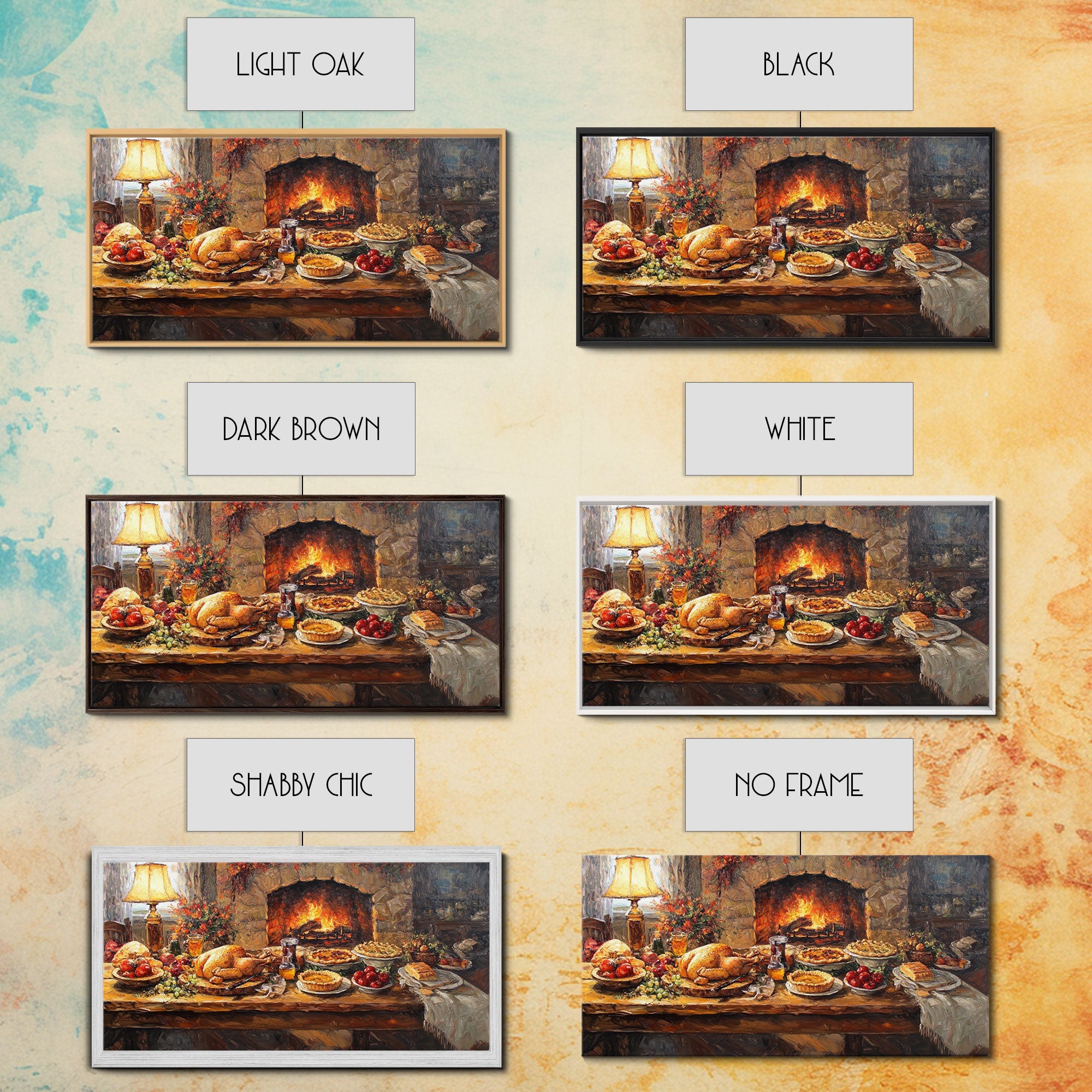 Cozy Thanksgiving Feast by Fireplace Framed Canvas Print Seasonal Wall Art, Rustic Fall Decor, Harvest Celebration Art Print for Home