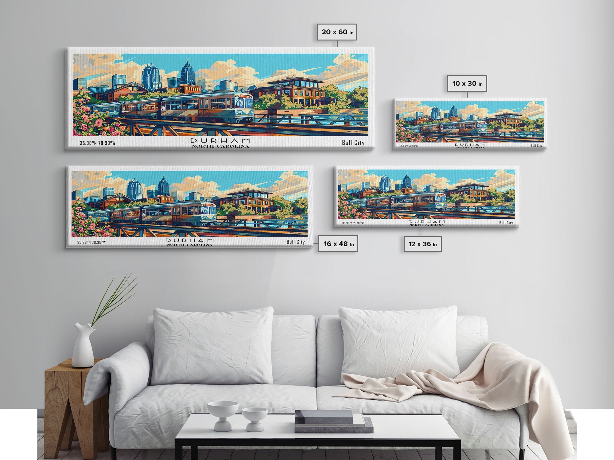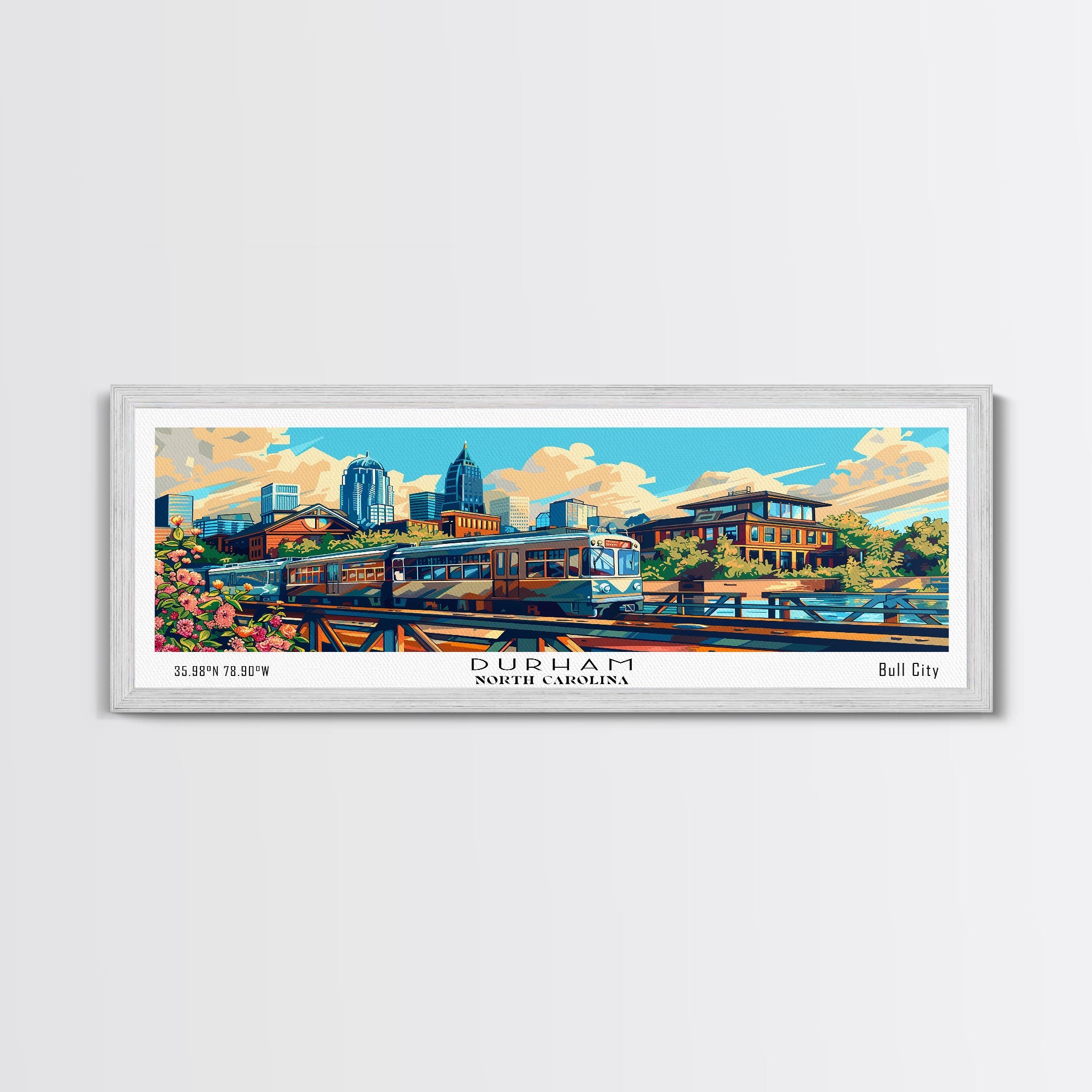 Durham North Carolina Panoramic Travel Poster Framed Canvas Print, Mid Century Modern Art, Pop Art Style, Wall Art Decor, Home Decoration