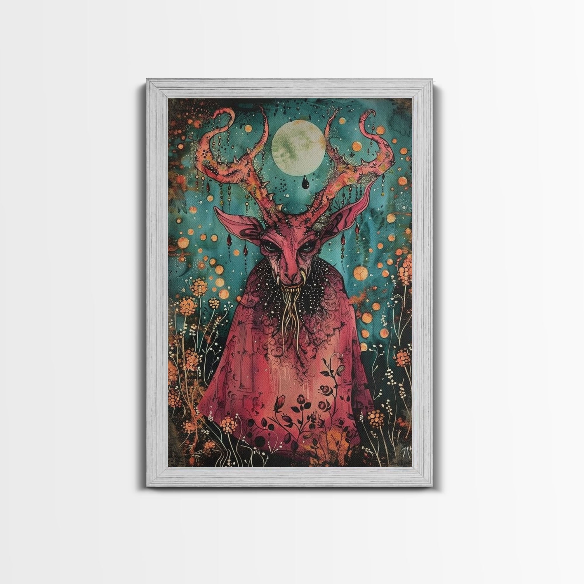 Enchanted Demon Under Full Moon Framed Canvas Print, Halloween Art, Creepy Wall Art, Spooky Home Decor, Art, Haunting Living Room Decor
