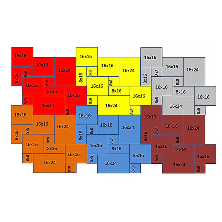 - Pattern Set Dimensions: 1- 16x24, 2- 16x16, 1- 8x16, 2- 8x8 for a total of 8 Square Feet per box. All tiles have a 1/2" thickness.
