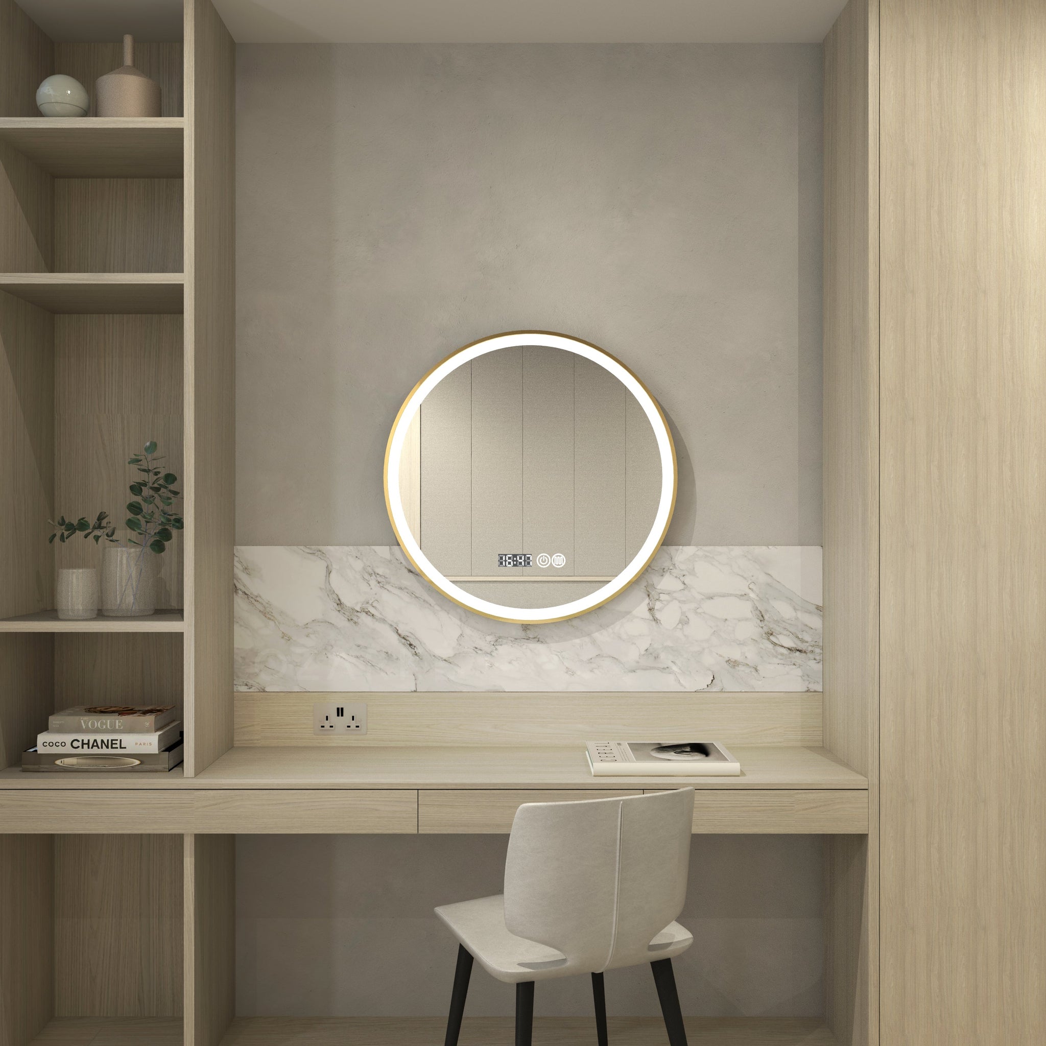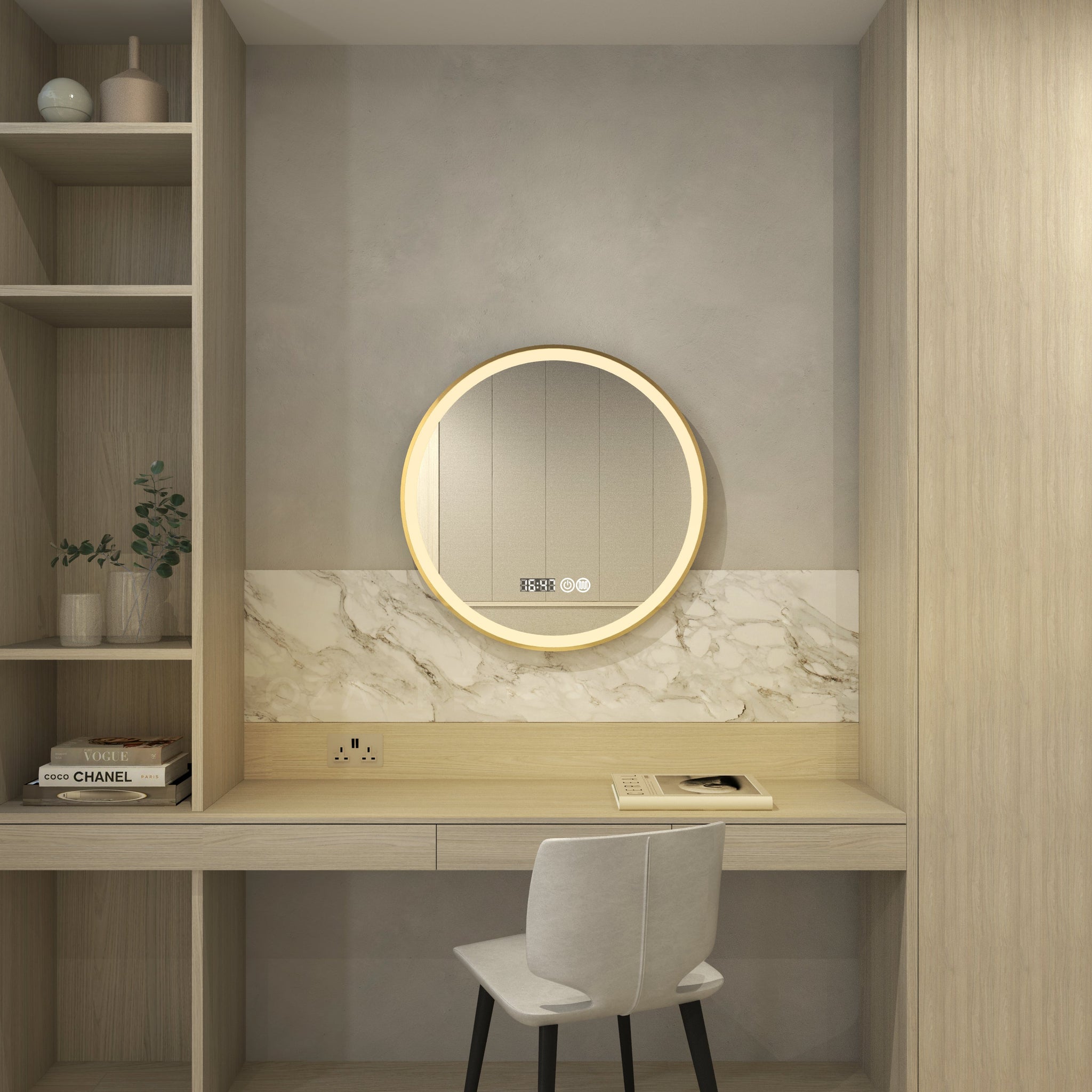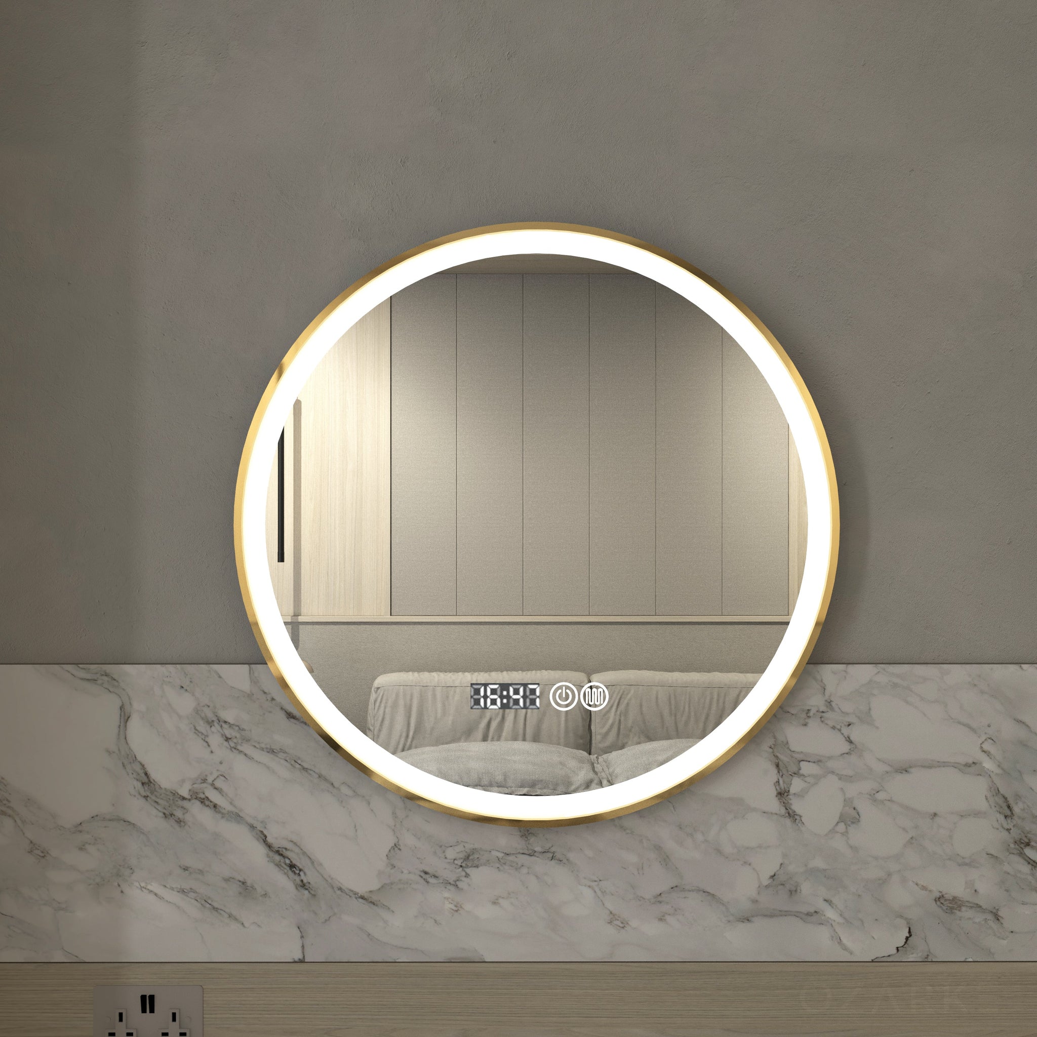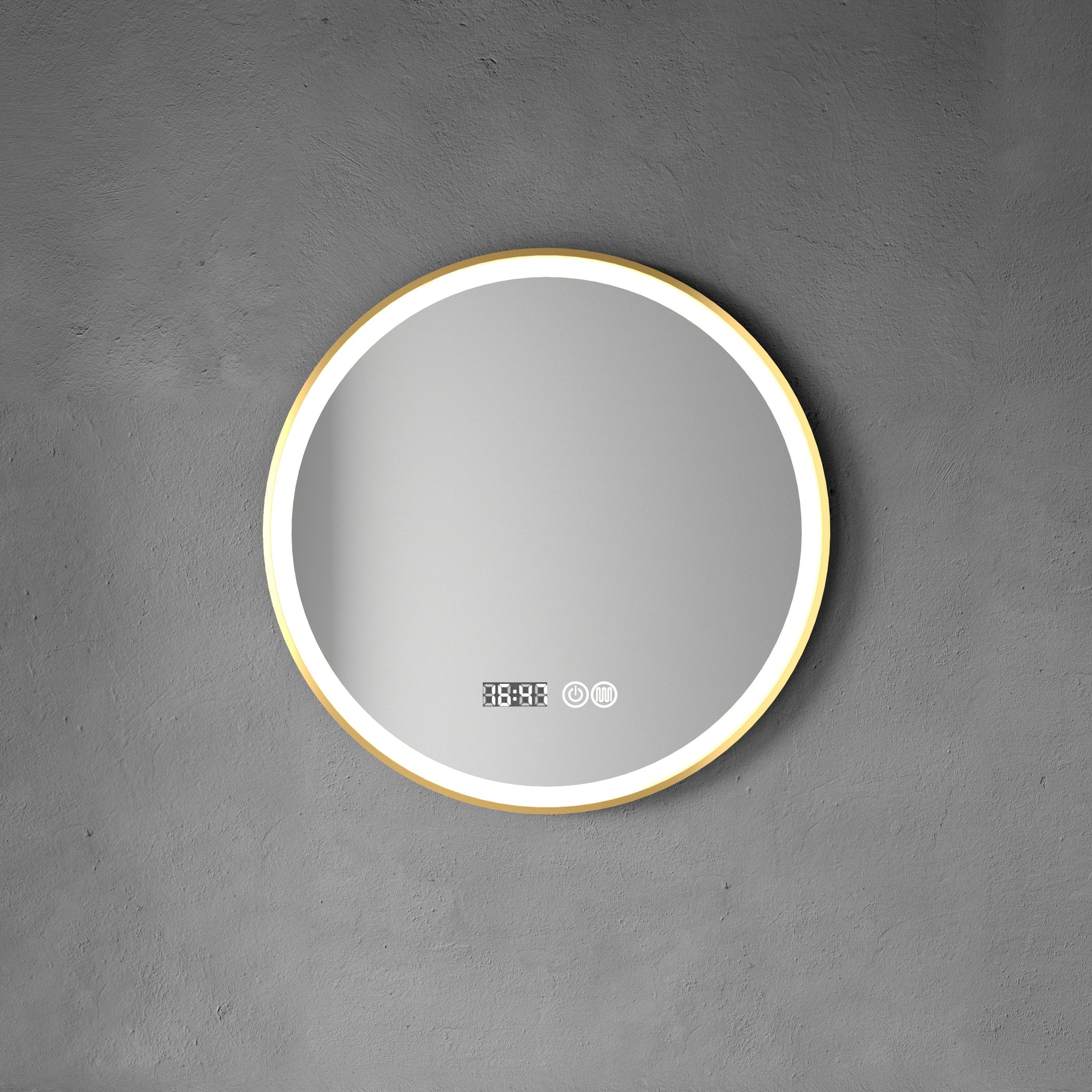 Elevate your vanity experience with our Gold Frame LED Vanity Mirror. Featuring a convenient 2-key touch switch control, toggle effortlessly between 3 light colors to suit any ambiance. Stay on schedule with the built-in Digital Clock, while the anti-fog feature ensures clarity during steamy showers. Experience glamour and functionality in one mirror.