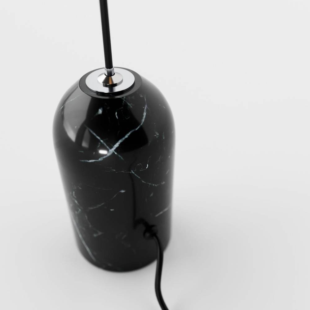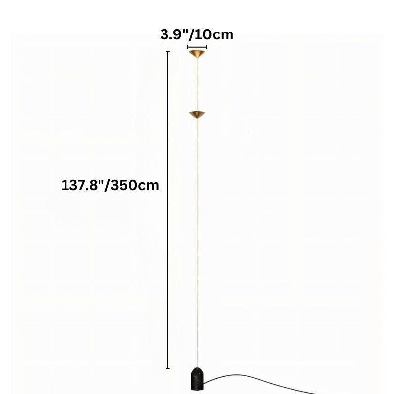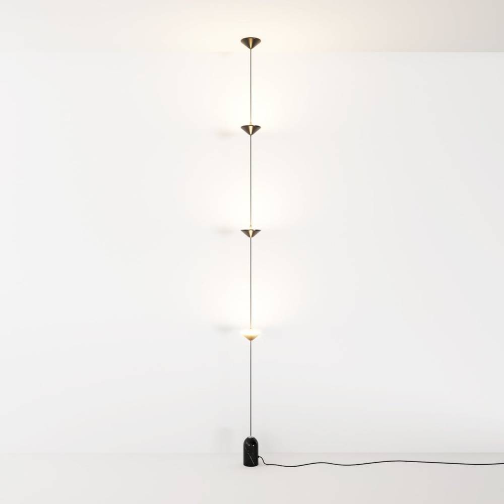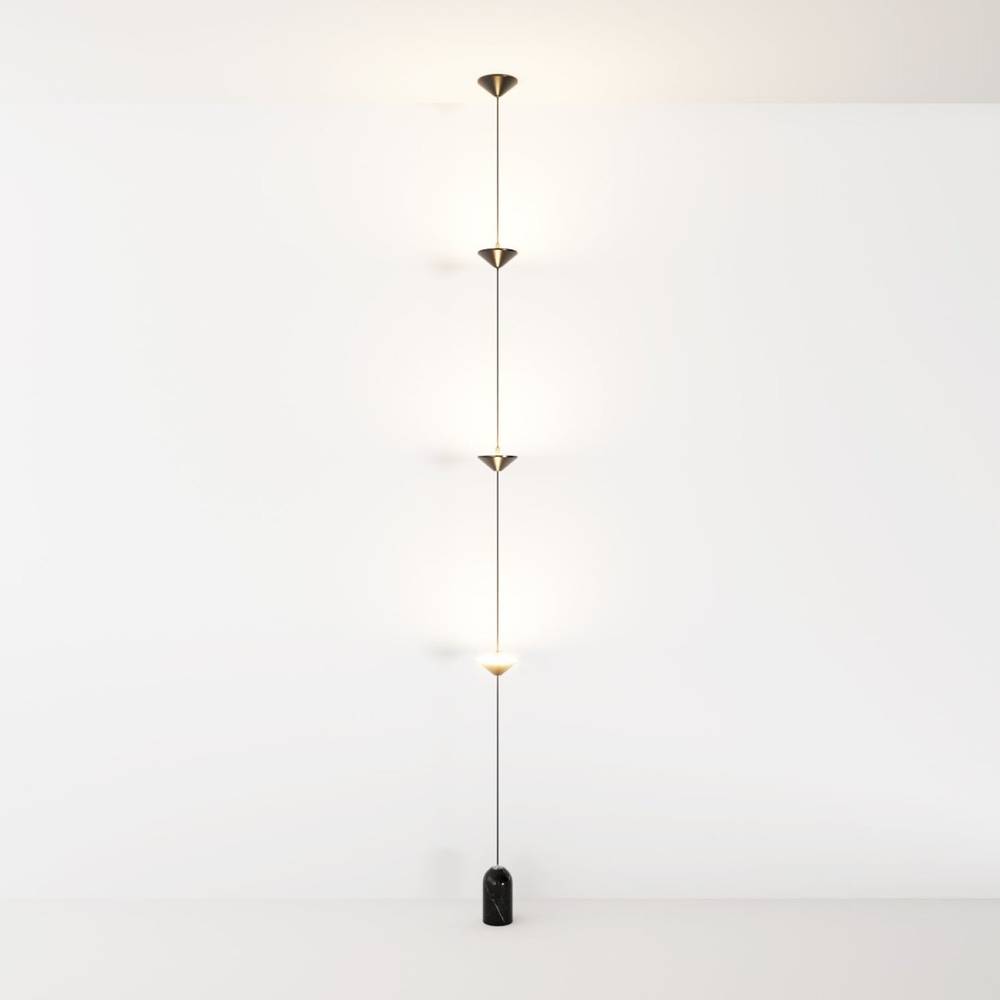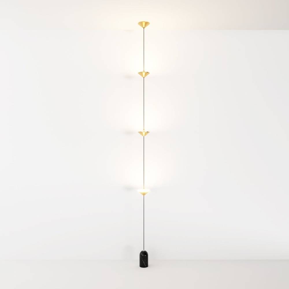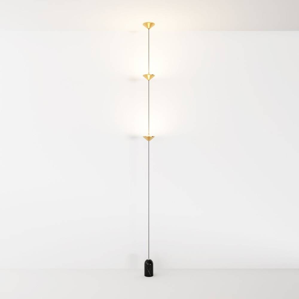 The Keilana Floor Lamp features three elegant conical aluminum shades suspended on a pull cable, finished in matte black or brass gold. A glossy marble counterweight provides stability and visual appeal. Anchored to the ceiling, it boasts strategically placed LEDs along its silhouette, casting a calming, inviting glow. Its modern design and functionality make it the perfect statement piece for any space.