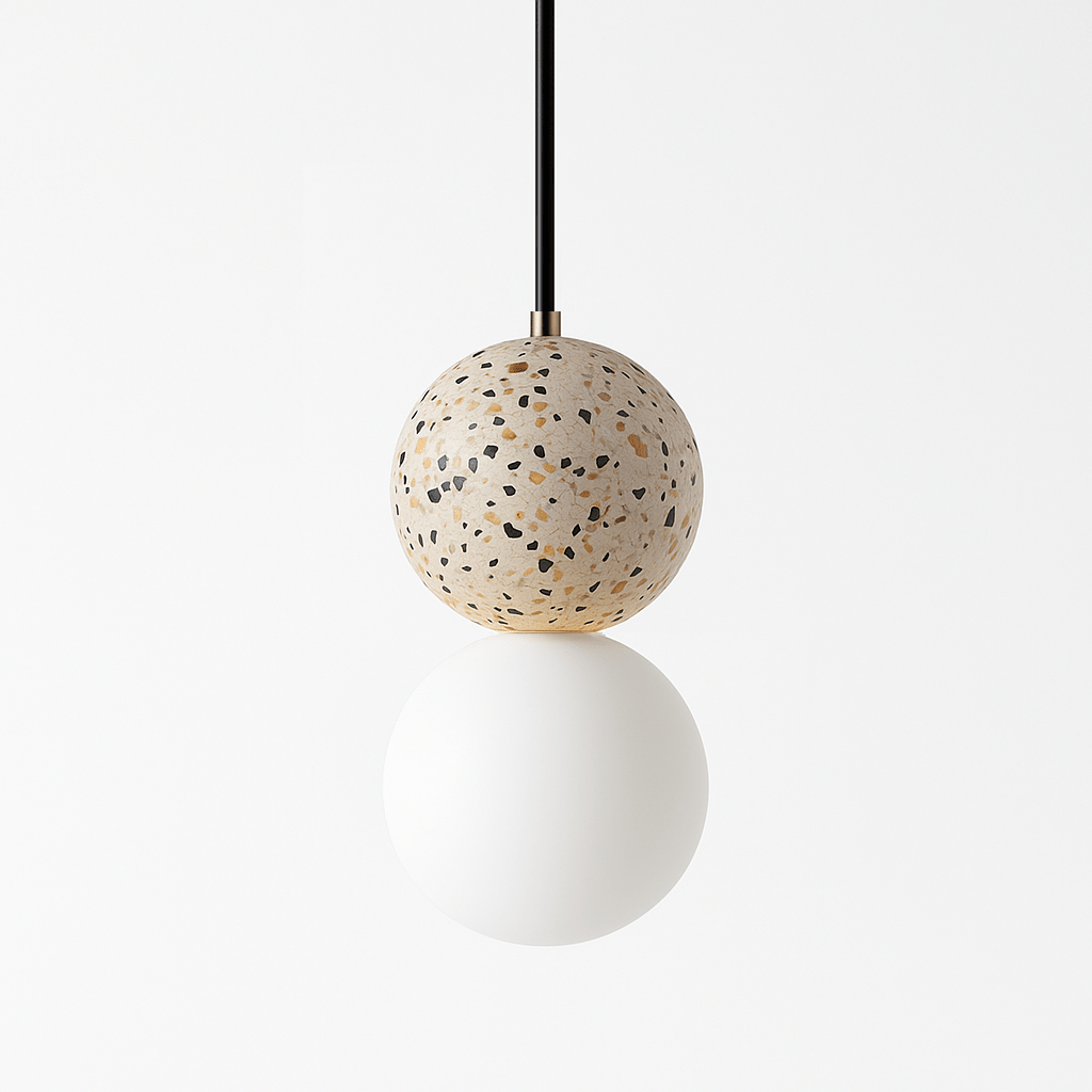 The Rondure Pendant Light combines opal glass and terrazzo stone for a unique design. Its stacked spherical shape contrasts smooth and textured surfaces, creating a dynamic light reflection. Available in four elegant colors, it adds modern flair to any space. Perfect for adding personality and style, this pendant light enhances your décor with both texture and light play.
