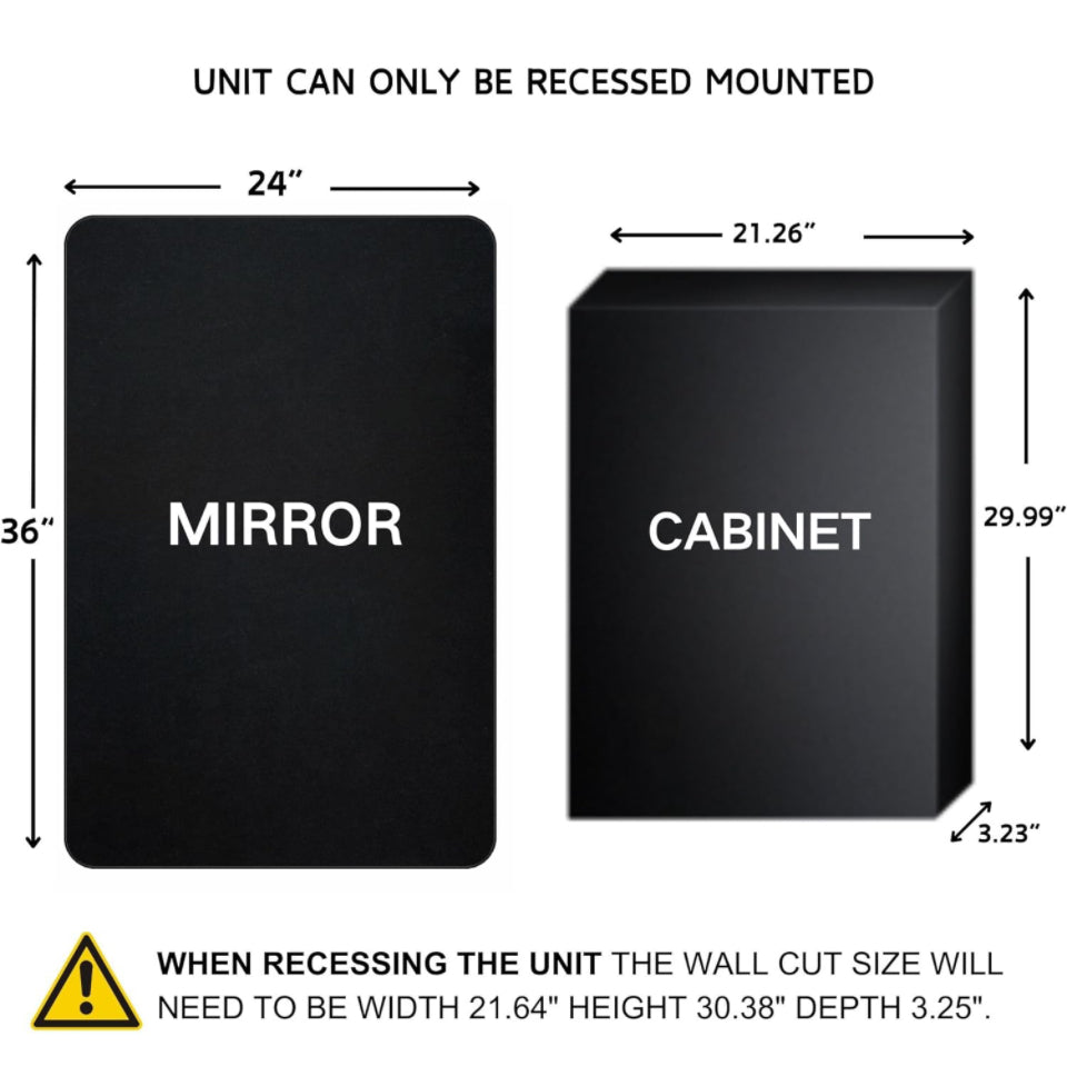 Overall: 24" wide x 4.96" deep x 36" high ; Wall Cutout: 21.64" wide x 30.38" high x 3.25" deep. Detailed dims could be found in the product description page