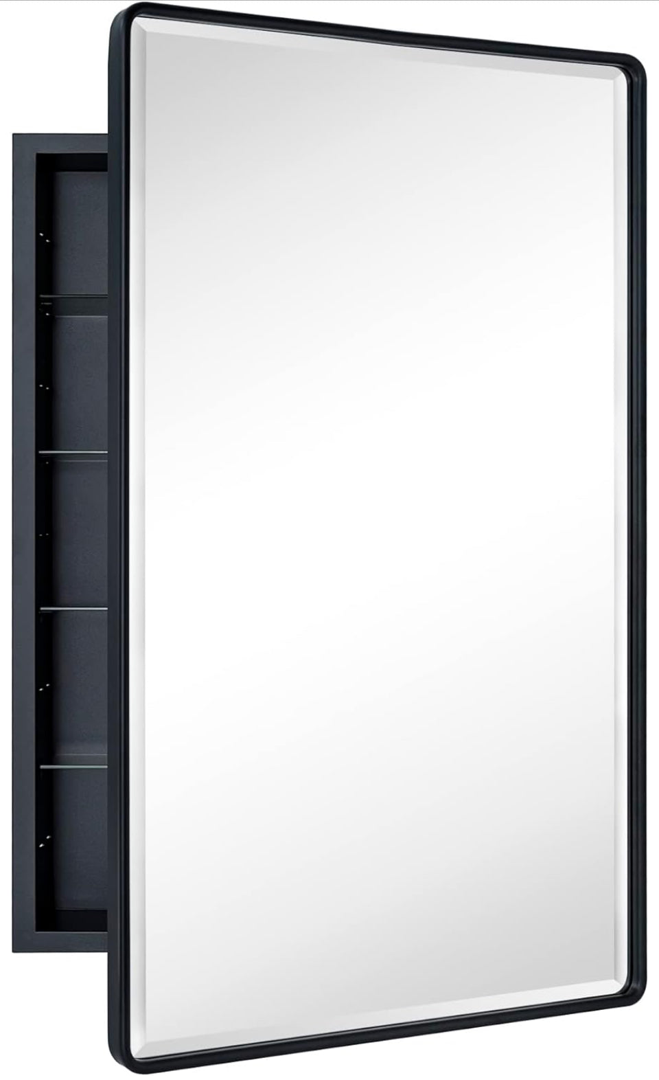 Aluminum Framed Medincine Cabinets: Premium aluminum door with matte black finish, framed with an elegantly beveled mirror. Door is coming with strong magnetic closure.