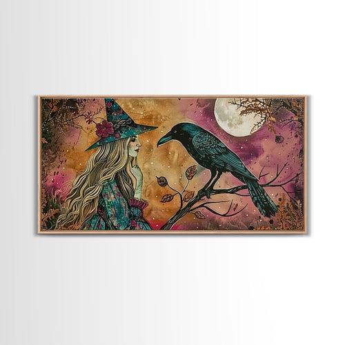 Cottagecore Witch & Raven, Springtime Witch, Halloween Art, Framed Canvas Print, Halloween Accessories, Halloween Decor