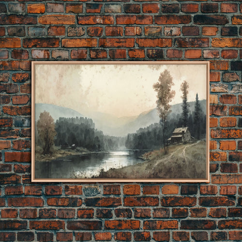 Cottage On The Lake, Wall Art, Framed Canvas Print, Subdued Minimalist Boho Style Wall Decor, Canvas Art, Rustic Decor