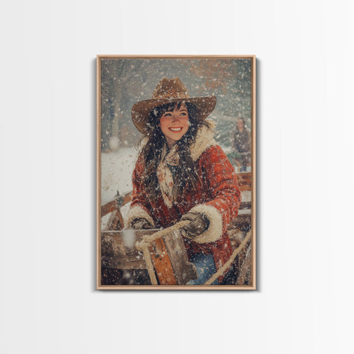 Country Christmas framed canvas print cheerful woman enjoying a snowy ride perfect seasonal wall art or vintage holiday home decor idea