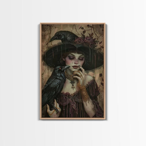 Cottage Core Witch With Raven Framed Canvas Print, Halloween Wall Decor / Wall Art, Spooky Witch, Spooky Month Gift Idea