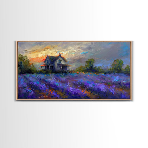 Country Cottage in Lavender Field, Impressionist Style, Framed Canvas Print, Farmhouse Decor, Cozy Art, Rustic Living Room