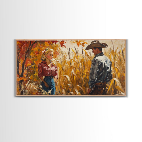 Cowboy and Cowgirl Fall Scene Framed Canvas Print - 2024 Rustic Autumn Love Country Art Gift Idea Fall Wall Decor