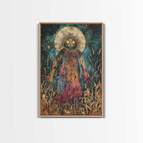Creepy Moonlit Scarecrow Framed Canvas Print | Halloween Art | Spooky Harvest Artwork | Sinister Scarecrow Art for Home Decor