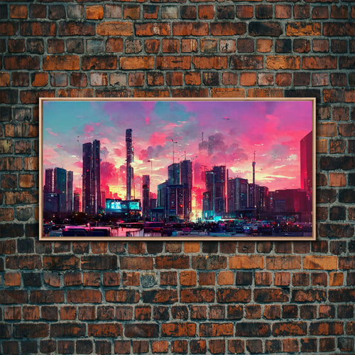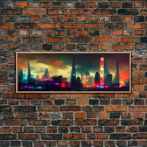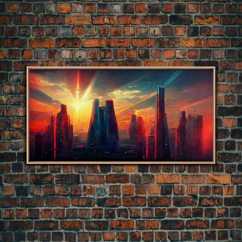Cyberpunk Cityscape, Ready To Hang Canvas Print, Panoramic, Cyberpunk Concept Art, Cityscape at Sunset, Cool mancave art, gift for him