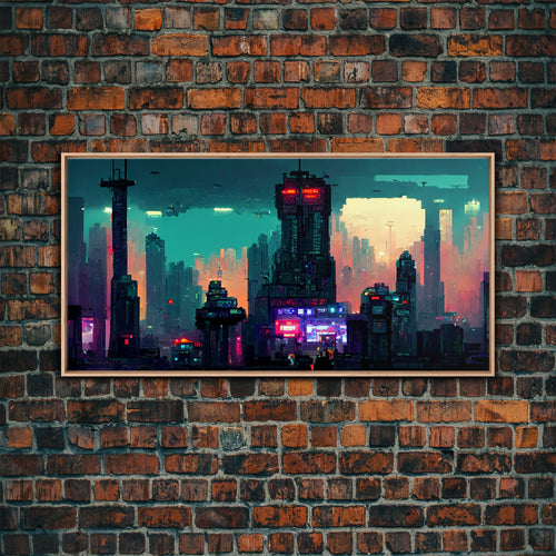 cyberpunk city pixel art canvas print, wall art, Bladerunner vibes art, synthwave style art, cool wall art