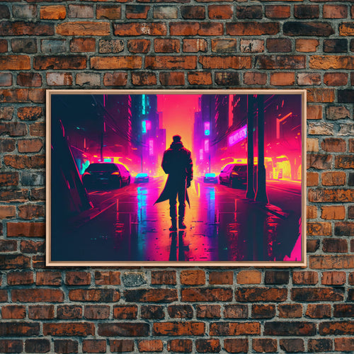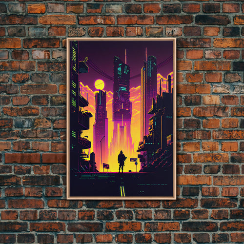 Cyberpunk bounty hunter art, vaporwave synthwave dystopian cityscape, framed canvas print