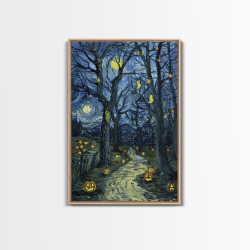 Dark Forest Path with Pumpkins Framed Canvas Print, Halloween Wall Art, Starry Night Inspired, Home Decor, Spooky Art, Living Room Decor