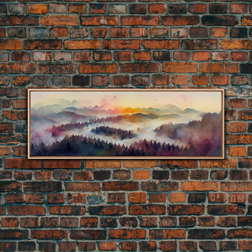 Dramatic Watercolor Sunset Landscape, Ready To Hang Canvas Print, Panoramic, Emerald Green Landscape Wall Decor