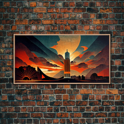 Dystopian metropolis canvas print, ready to hang wall art, art deco sunset, 1930s architecture, living room art, art nouveau