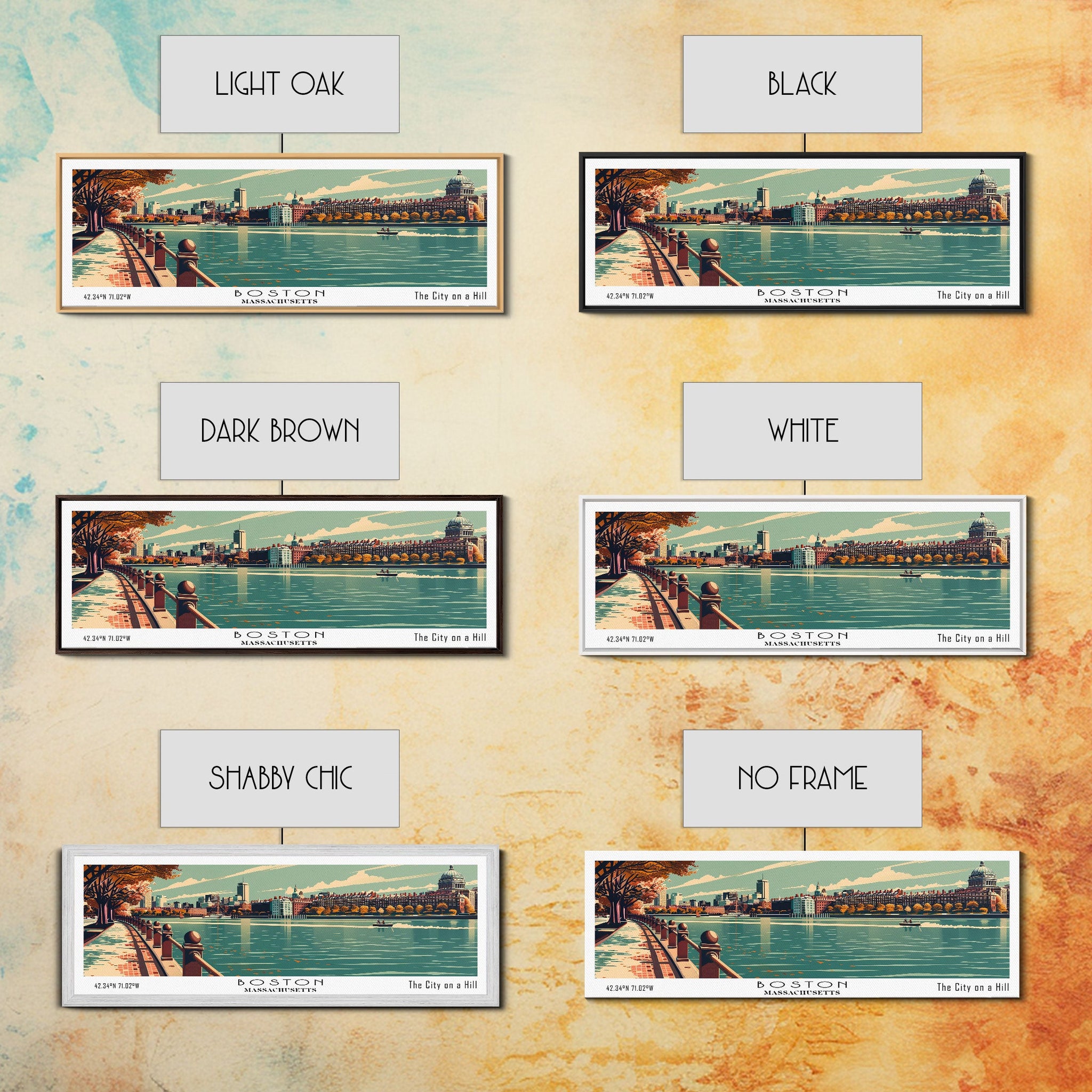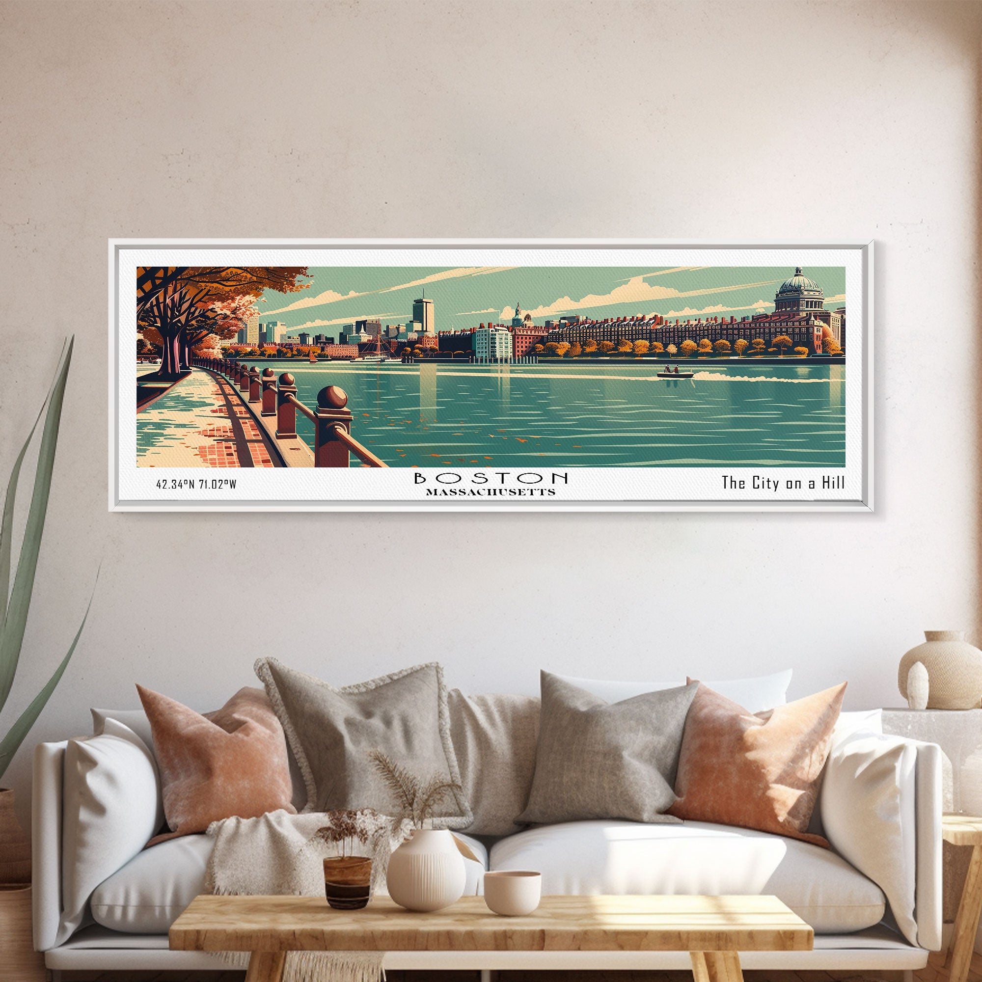 Boston Massachusetts Panoramic Painting, Framed Canvas Print, Mid Century Modern Wall Art, Retro Pop Art Travel Poster, Home Decor, City Art