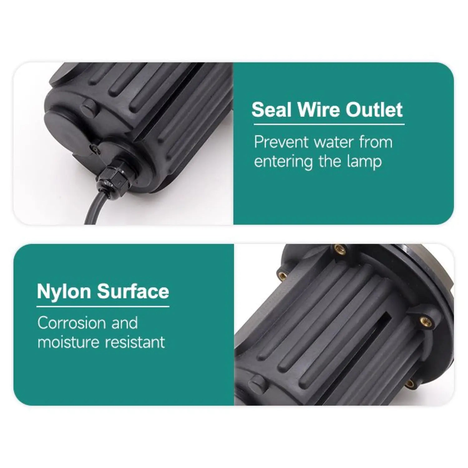 In-ground lights with MR16 socket, constructed from brass and PVC for outdoor lighting applications.