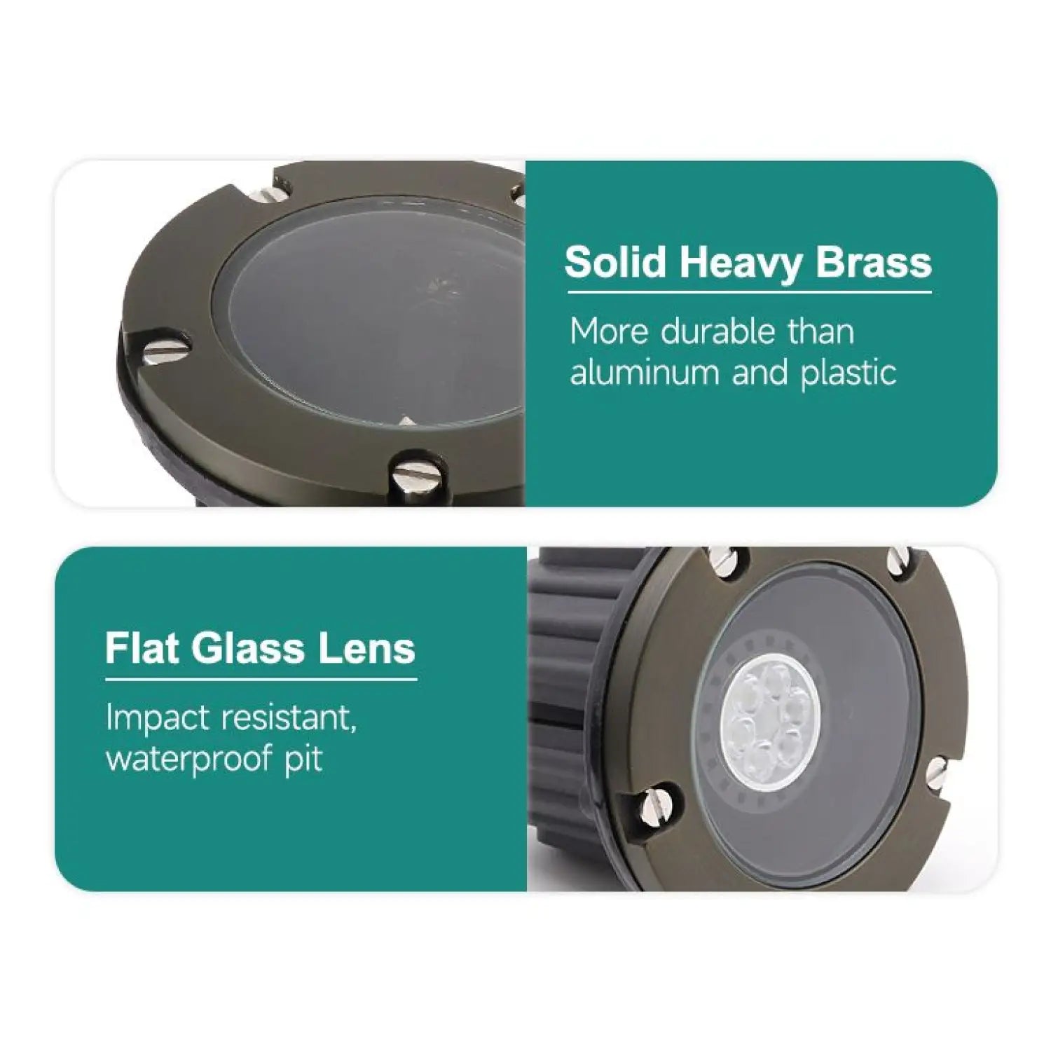 Inground lights made of brass and PVC, designed for MR16 bulbs and suitable for outdoor installation.