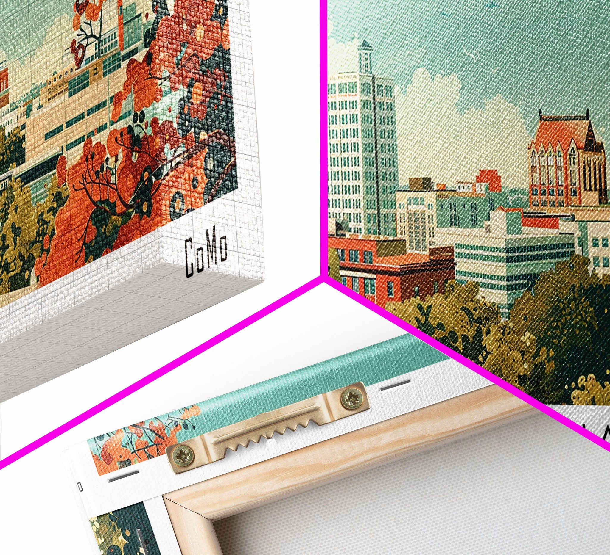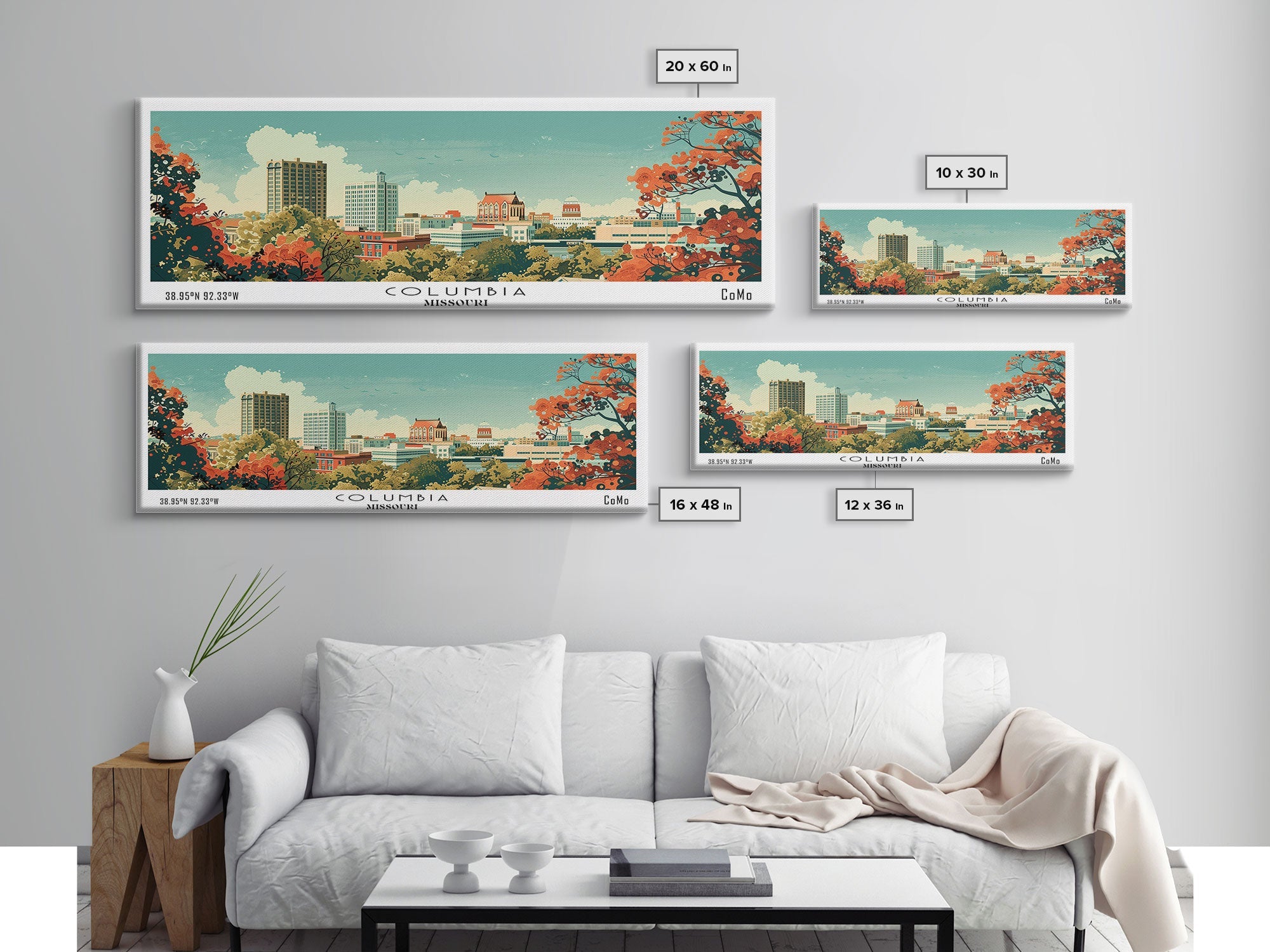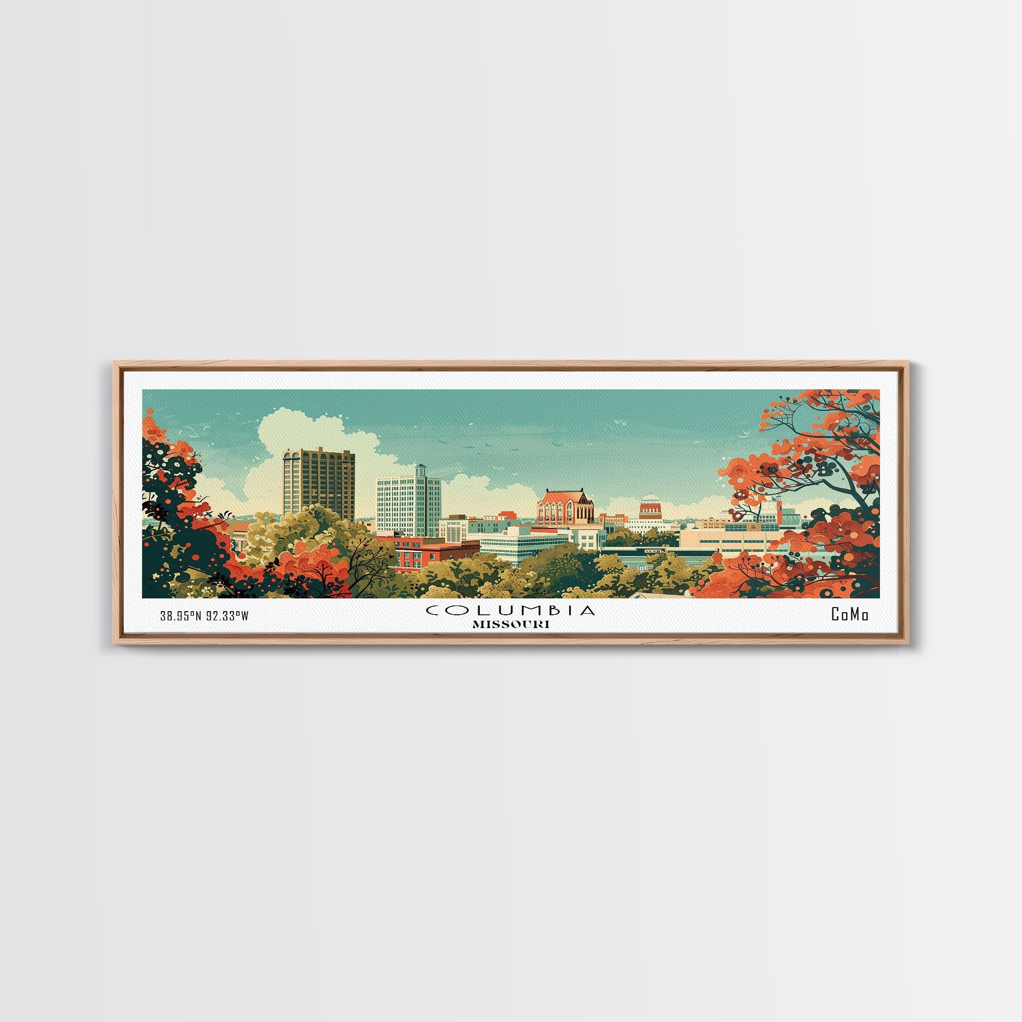 Columbia Missouri Panoramic Wall Art, Mid Century Modern Framed Canvas Print, Retro Pop Art Travel Poster, City Home Decor, Office Wall Art