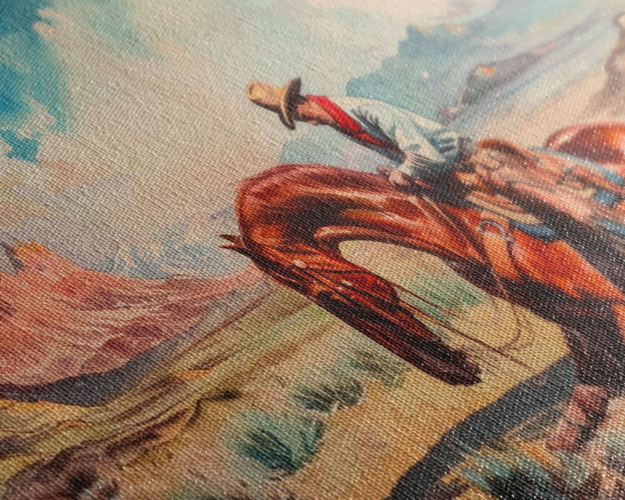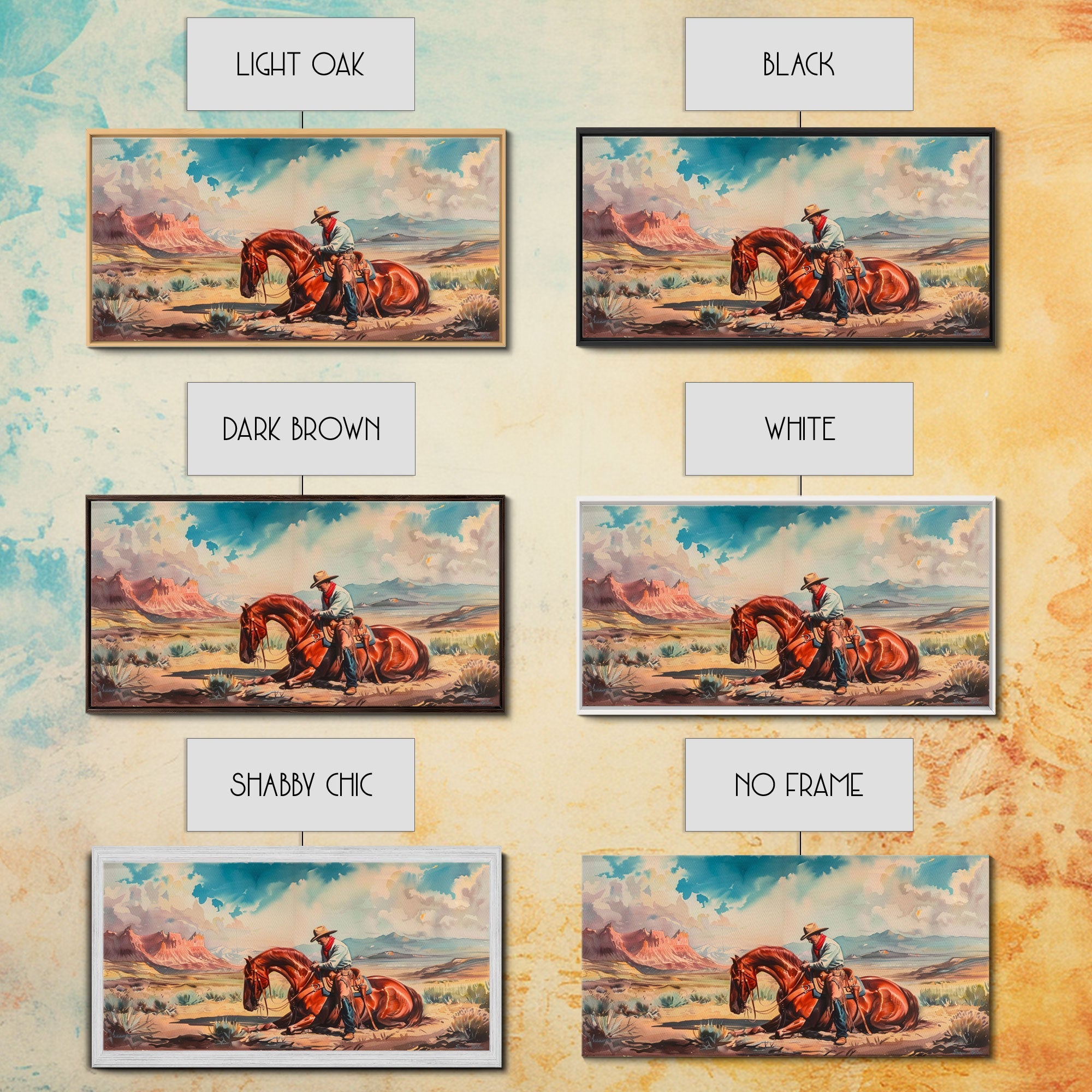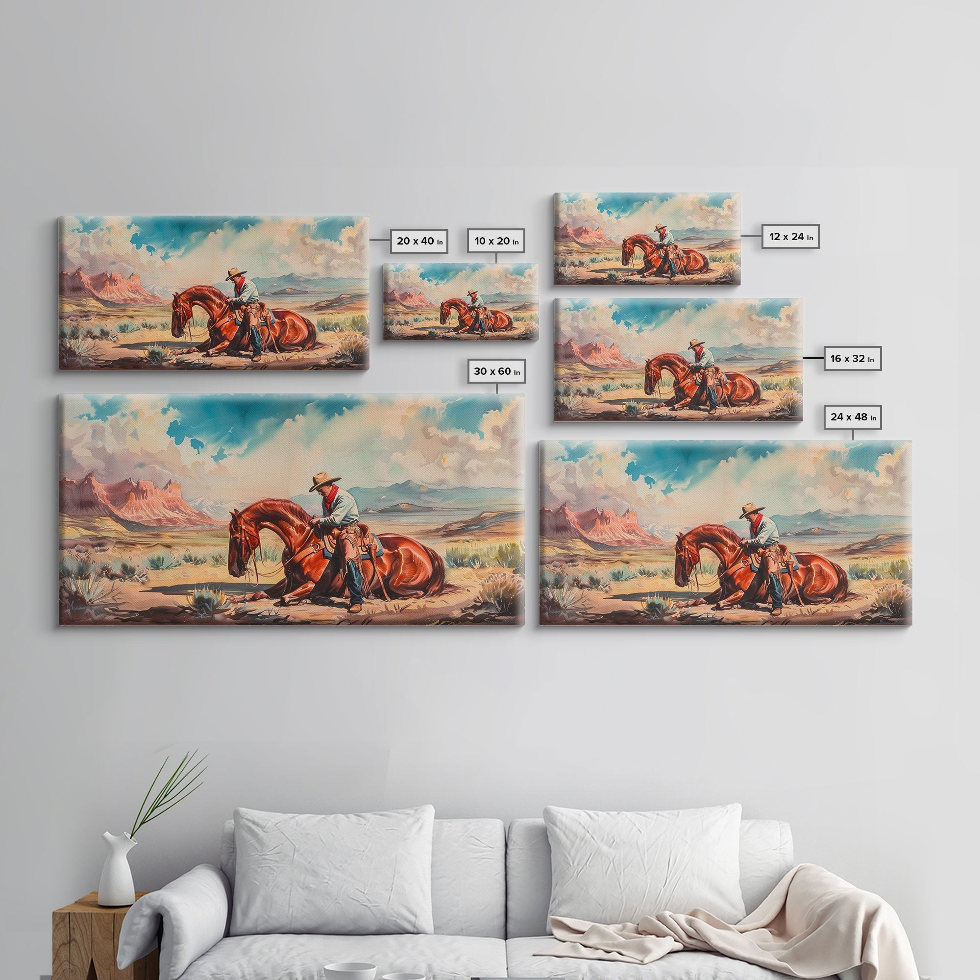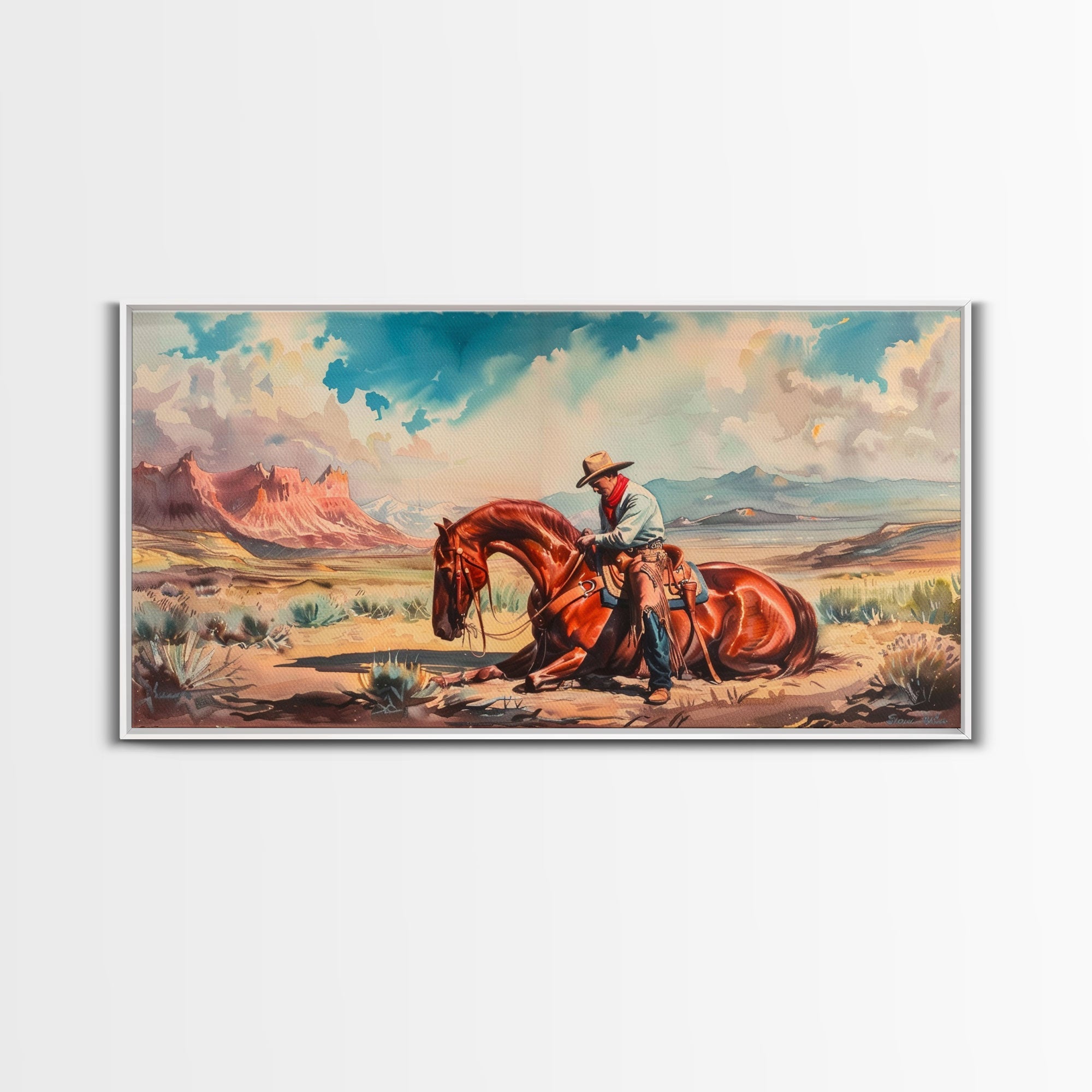 Cowboy Comforting Horse in Open Plains, Farmhouse Western Decor, Framed Canvas Print, Country Living Art, Rustic Wall Art for Home
