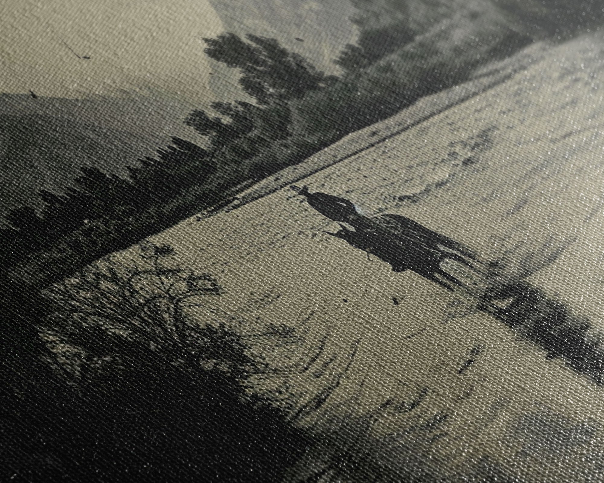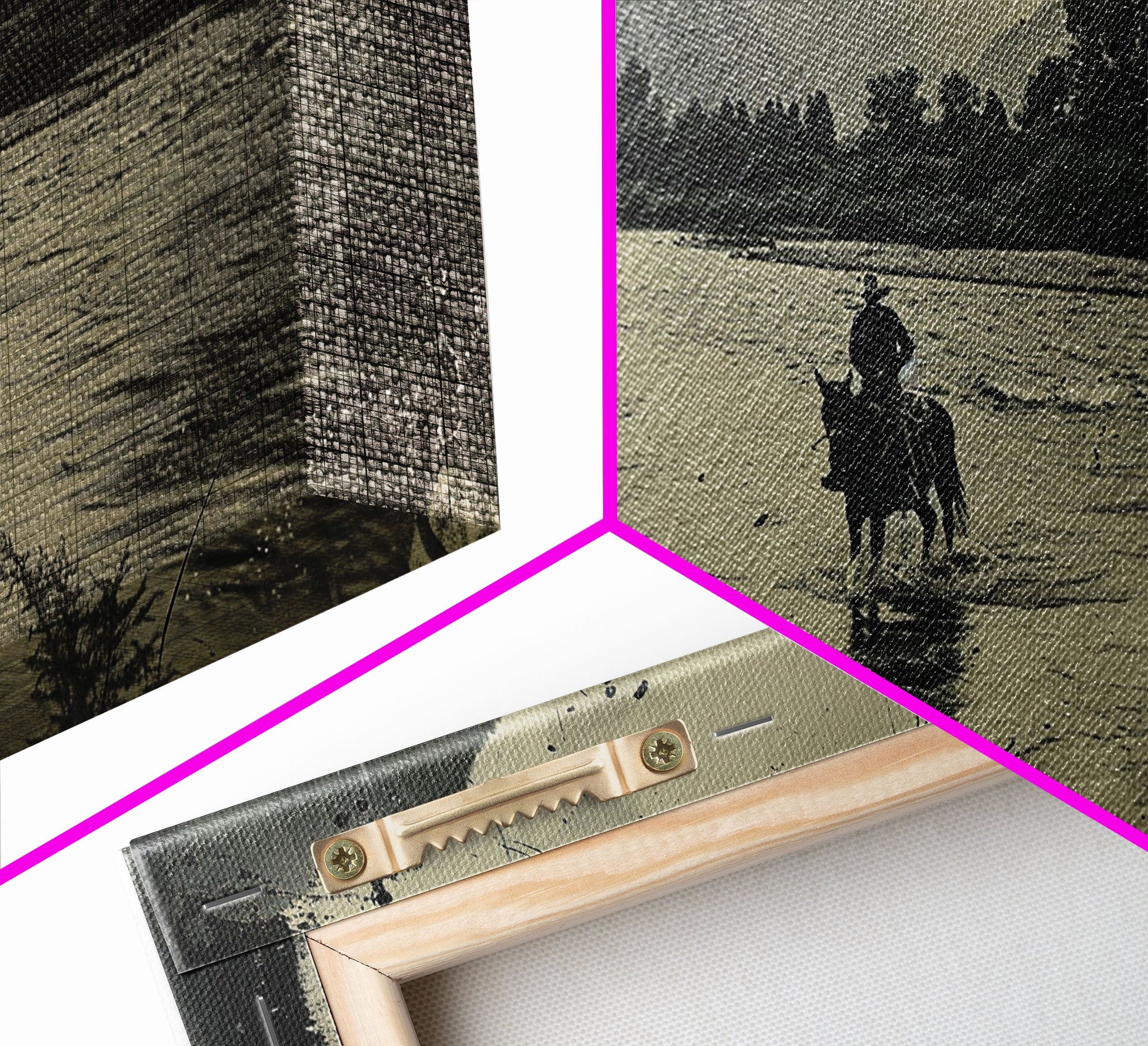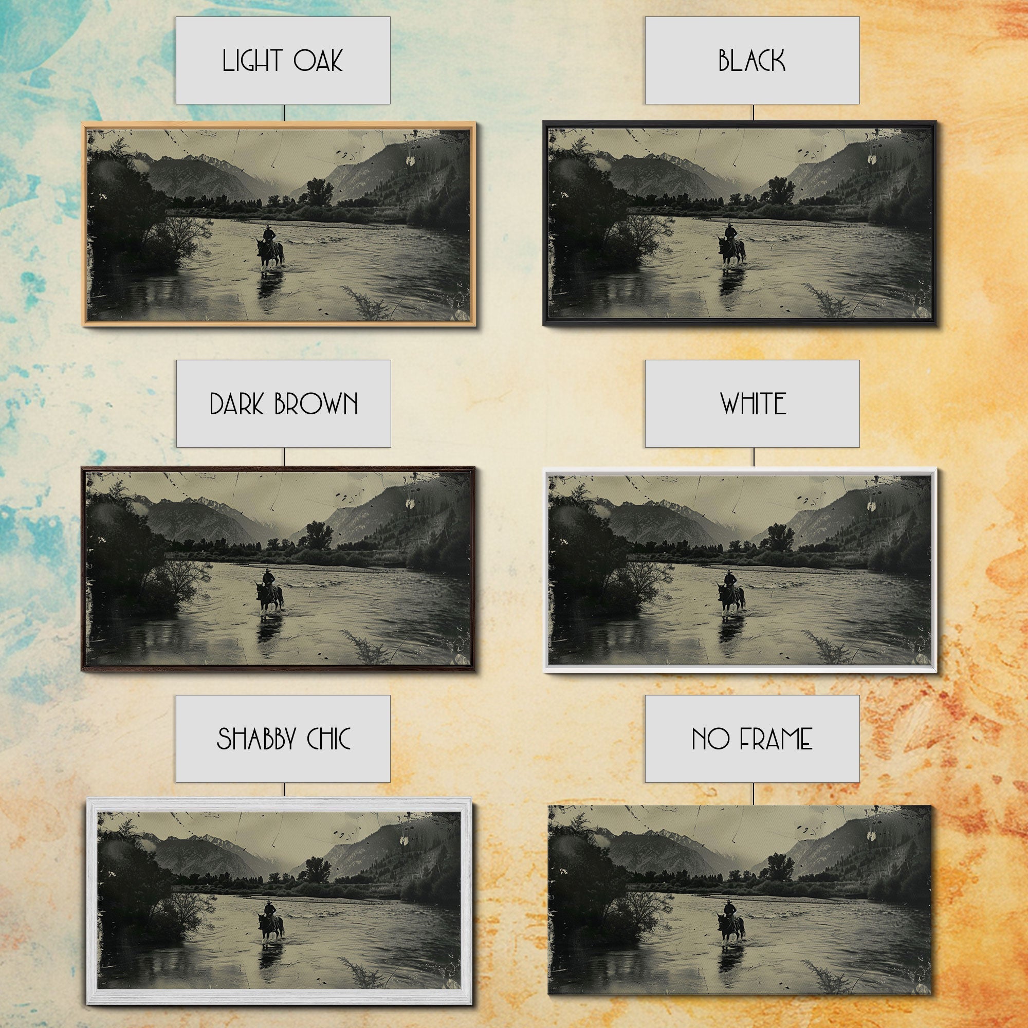 Cowboy Crossing River with Mountains, Framed Canvas Print for Western Living Room Decor, Ideal Bedroom Wall Art, Rustic Scene