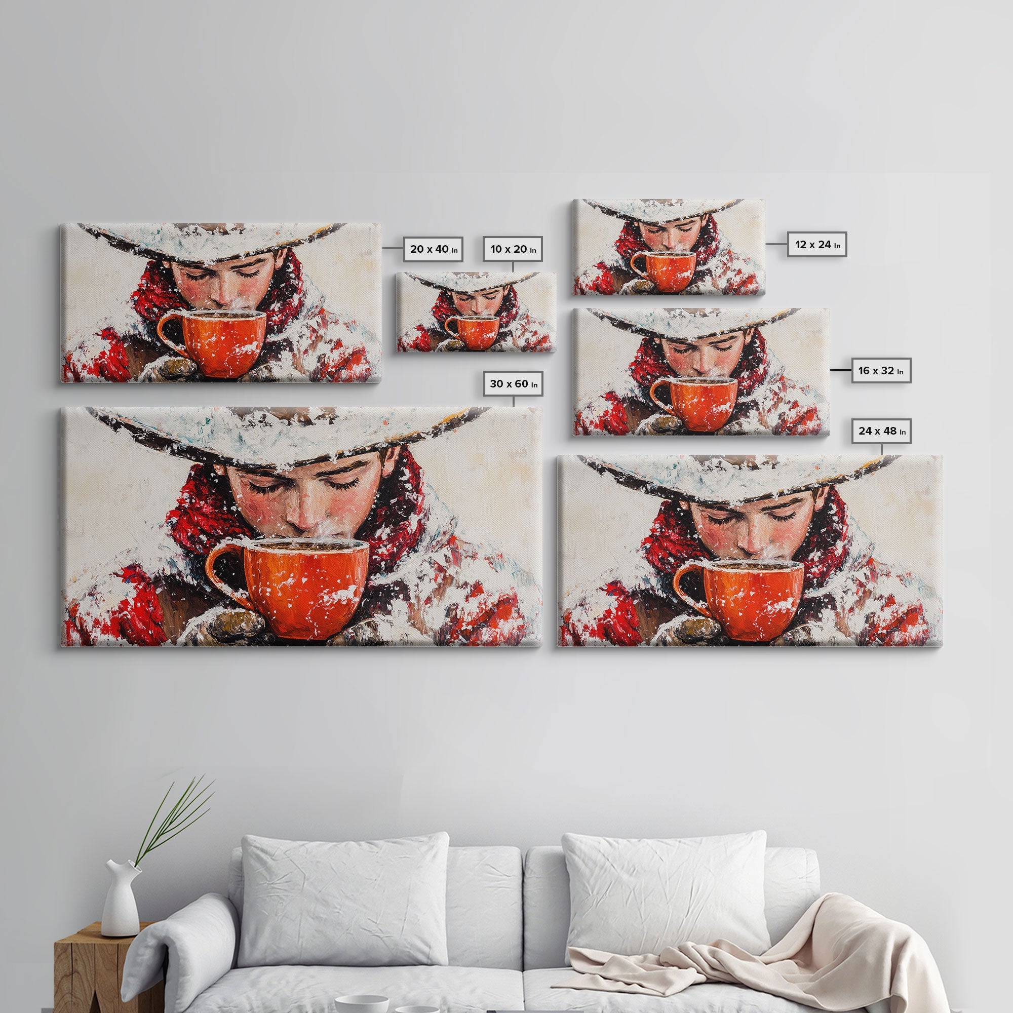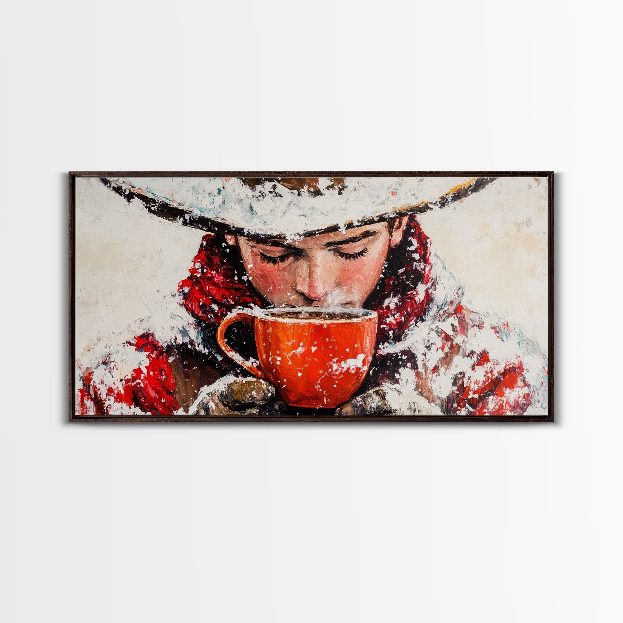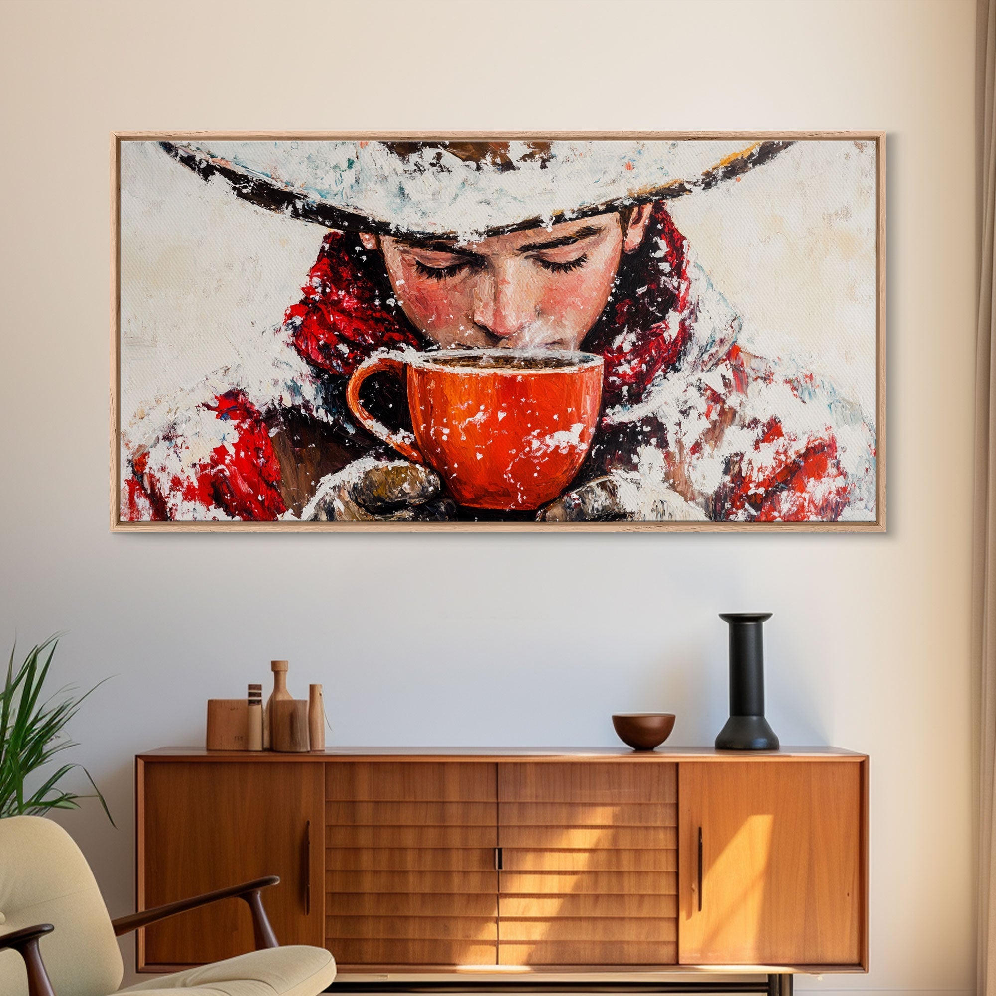 Cowboy in forest with burning fire, deep autumn hues, Framed Canvas Print, moody landscape, fall western art, rustic wall piece, wall decor
