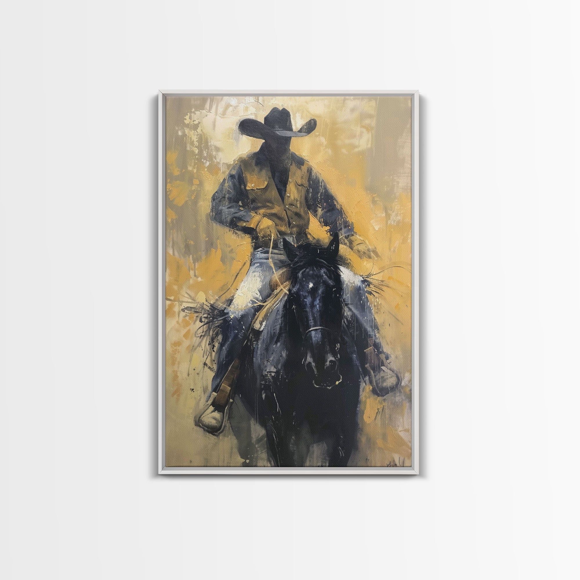 Cowboy in Full Gear Riding Horse - Framed Canvas Print, Western Wall Art, Rustic Decor, Living Room and Bedroom Art Print