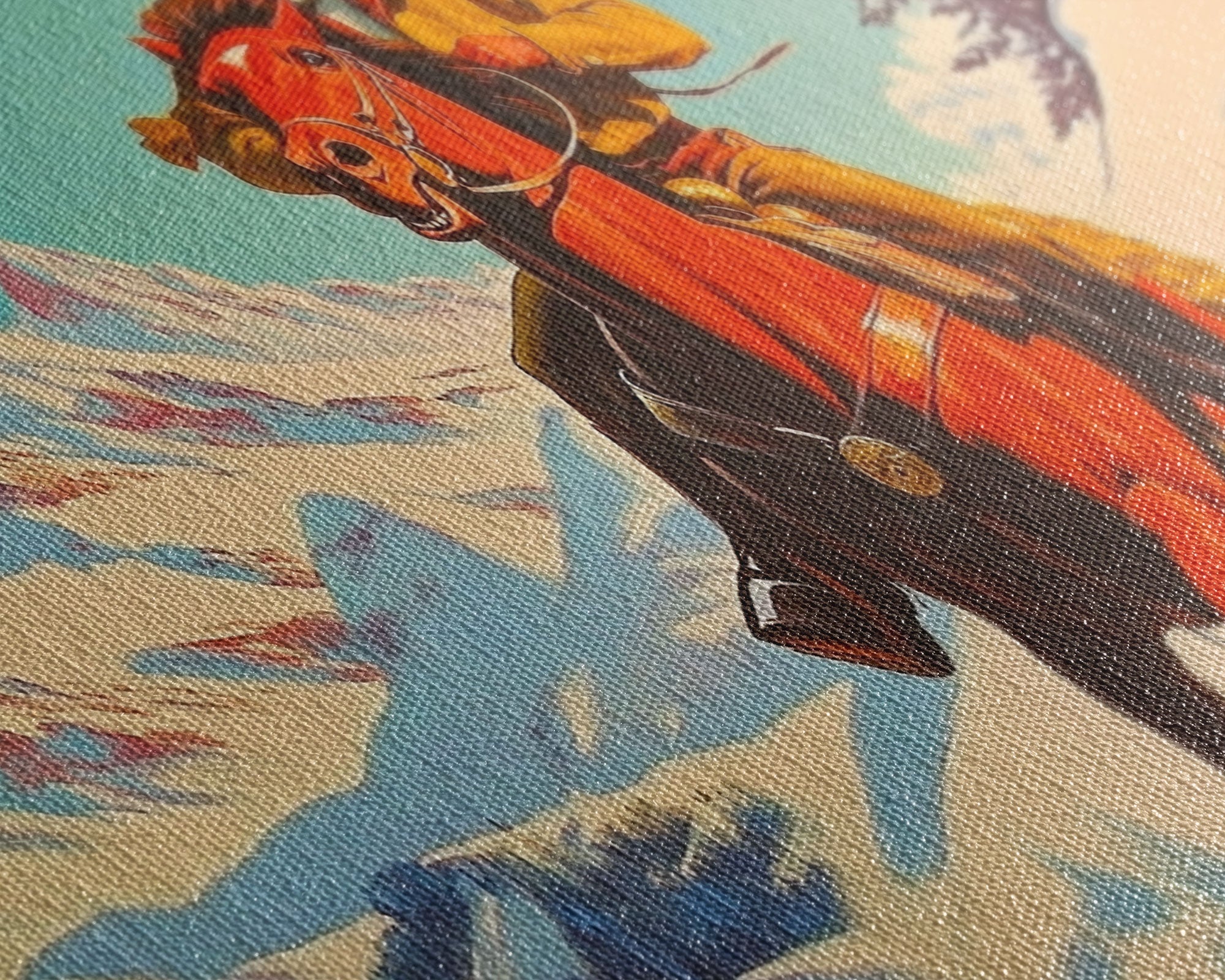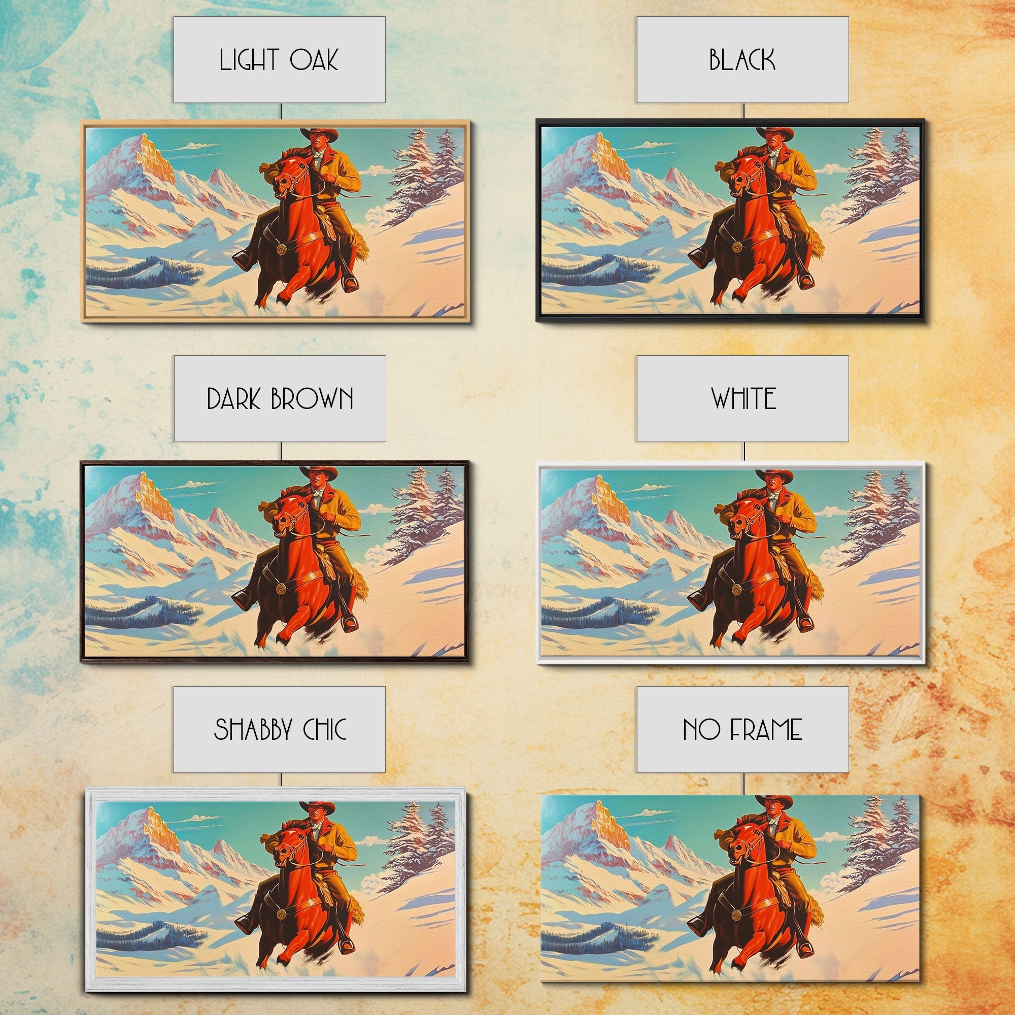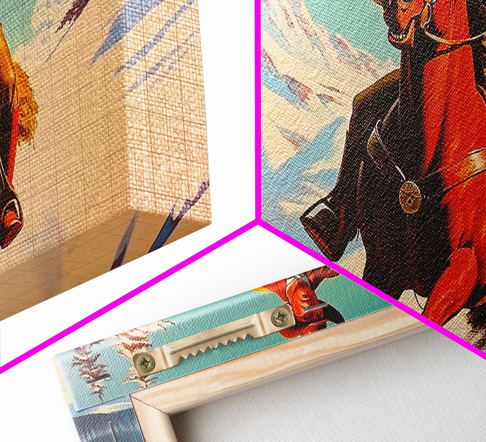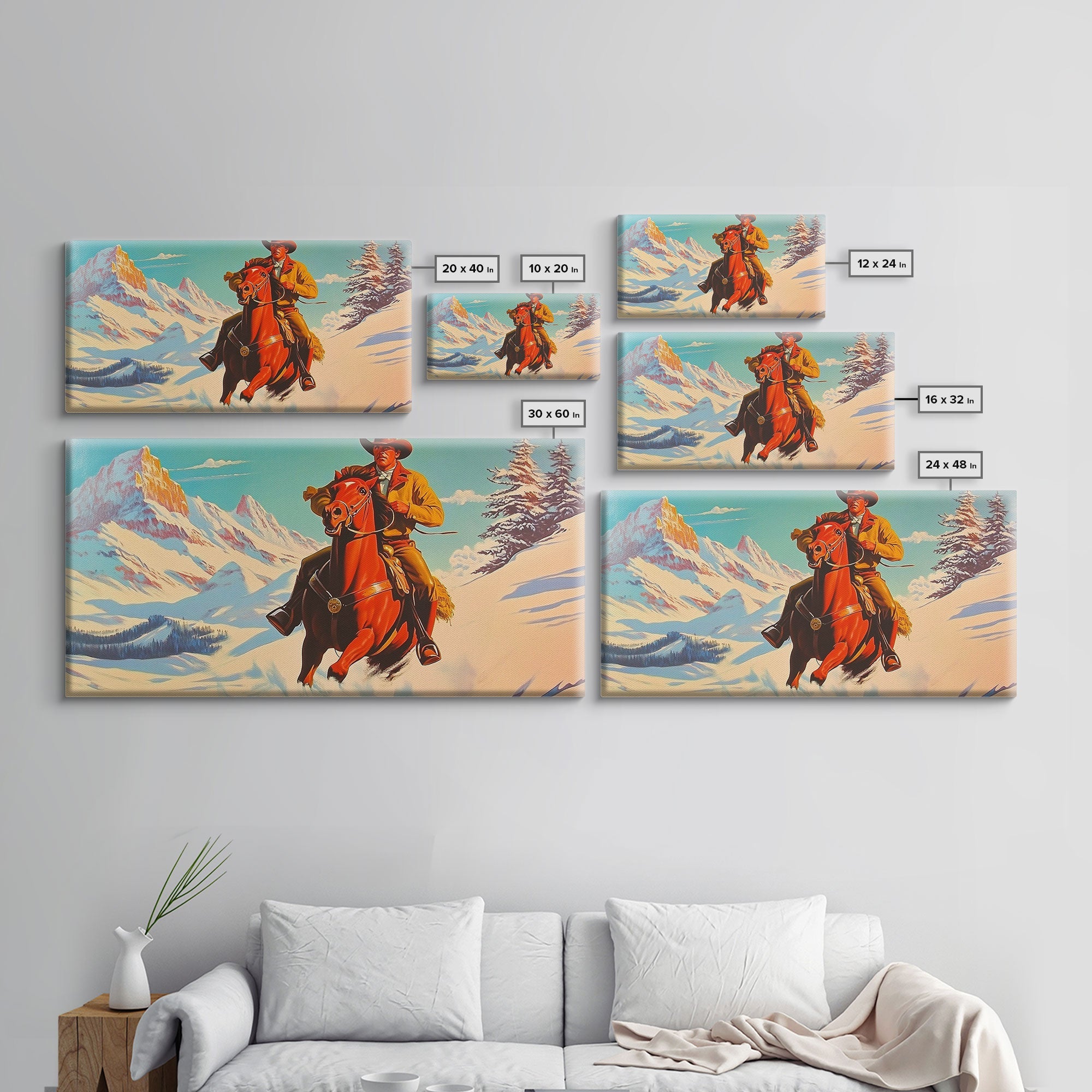 Cowboy in red jacket riding through snow-covered forest, Framed Canvas Print, vibrant winter wall art, rustic western decor