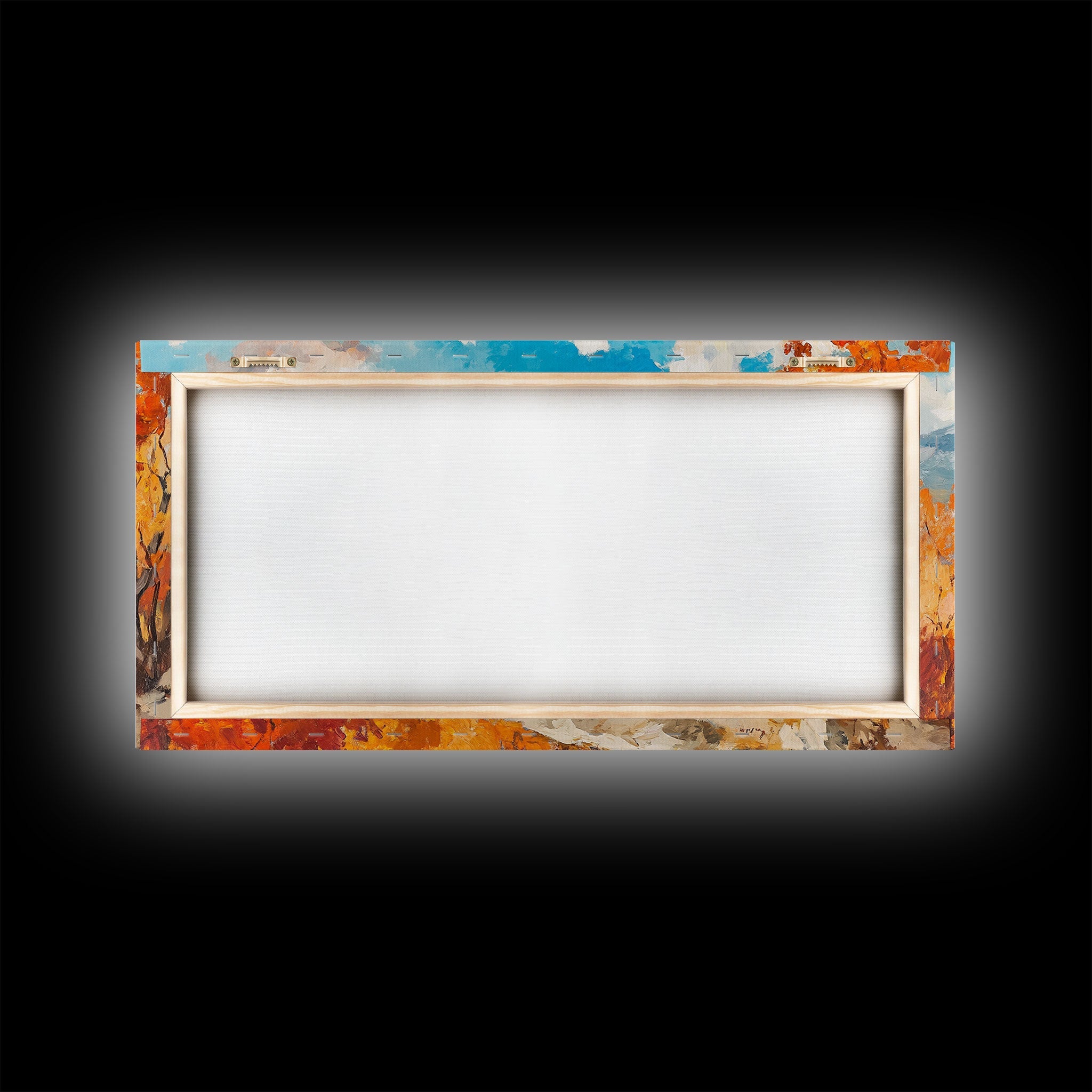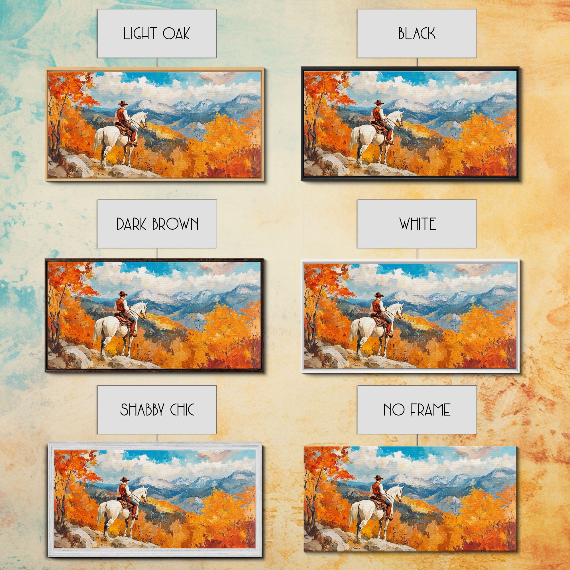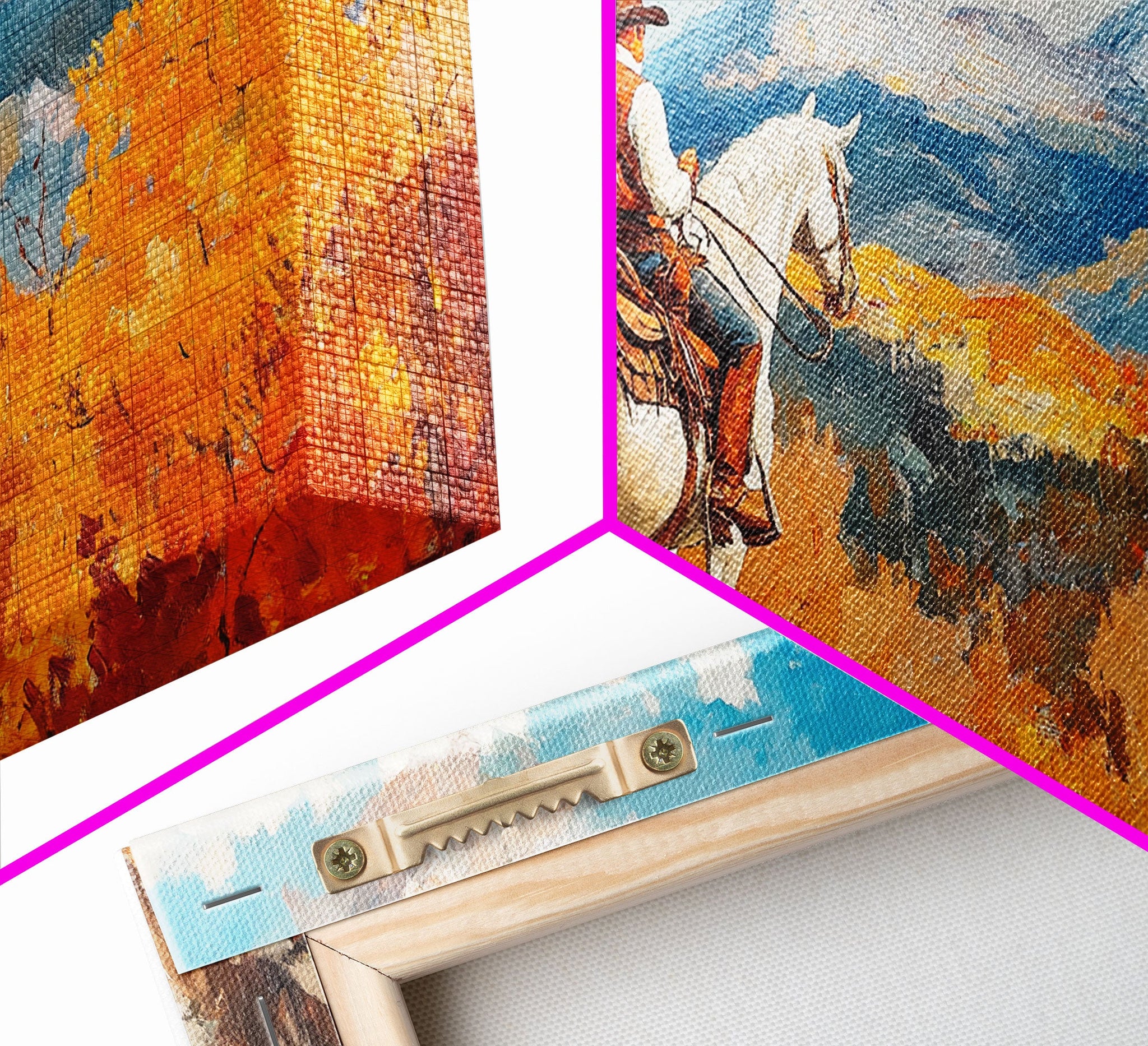 Cowboy on autumn swing, Framed Canvas Print, rustic Western art with vibrant fall, tall framed canvas print autumn decor farmhouse wall art