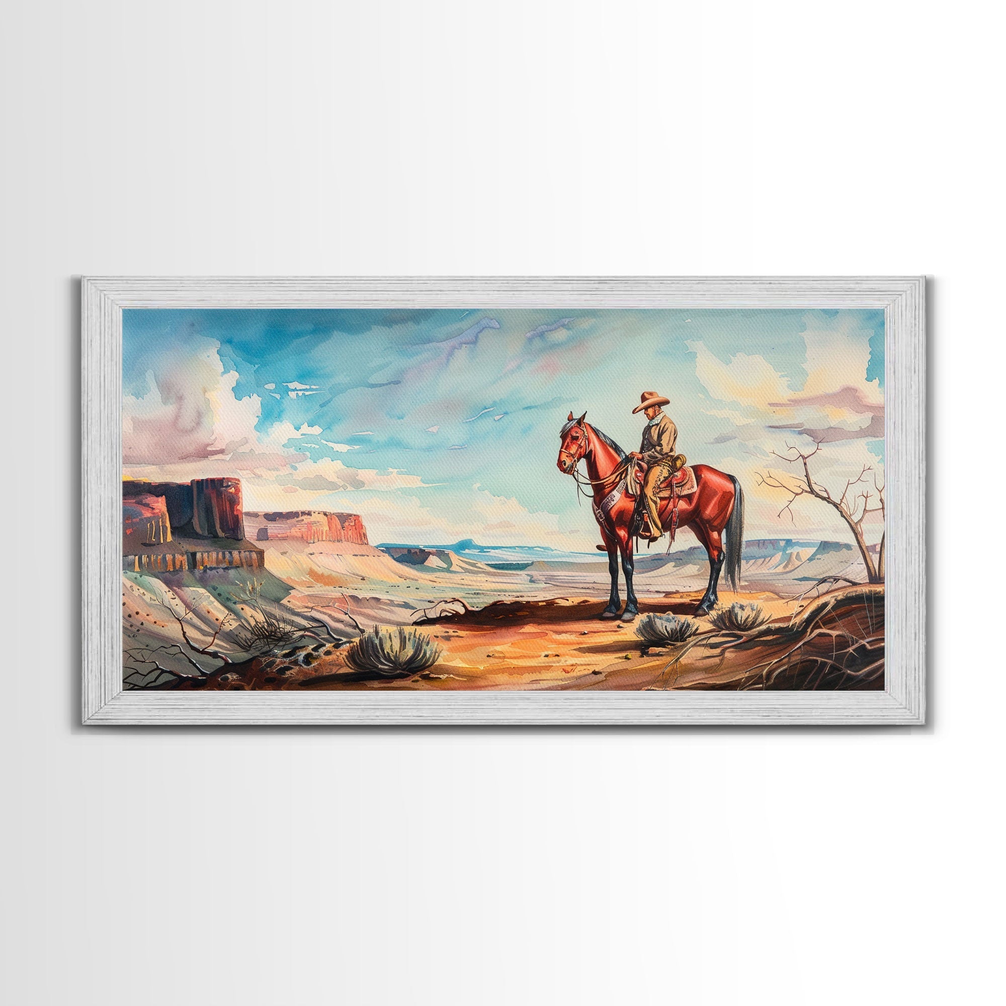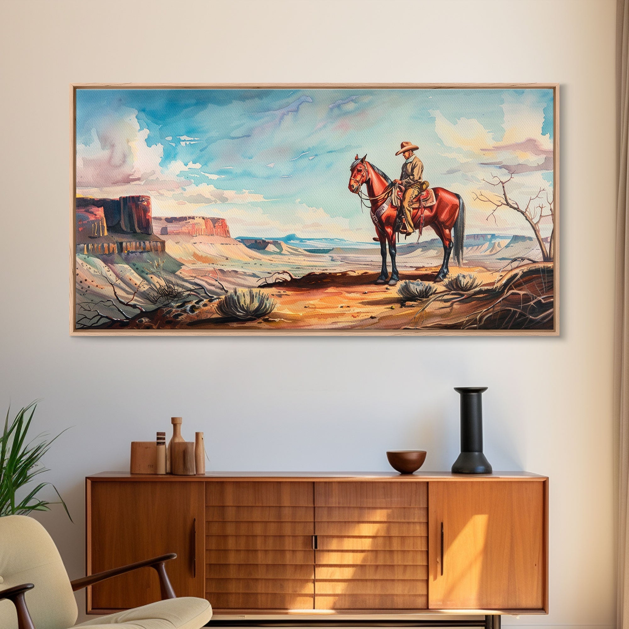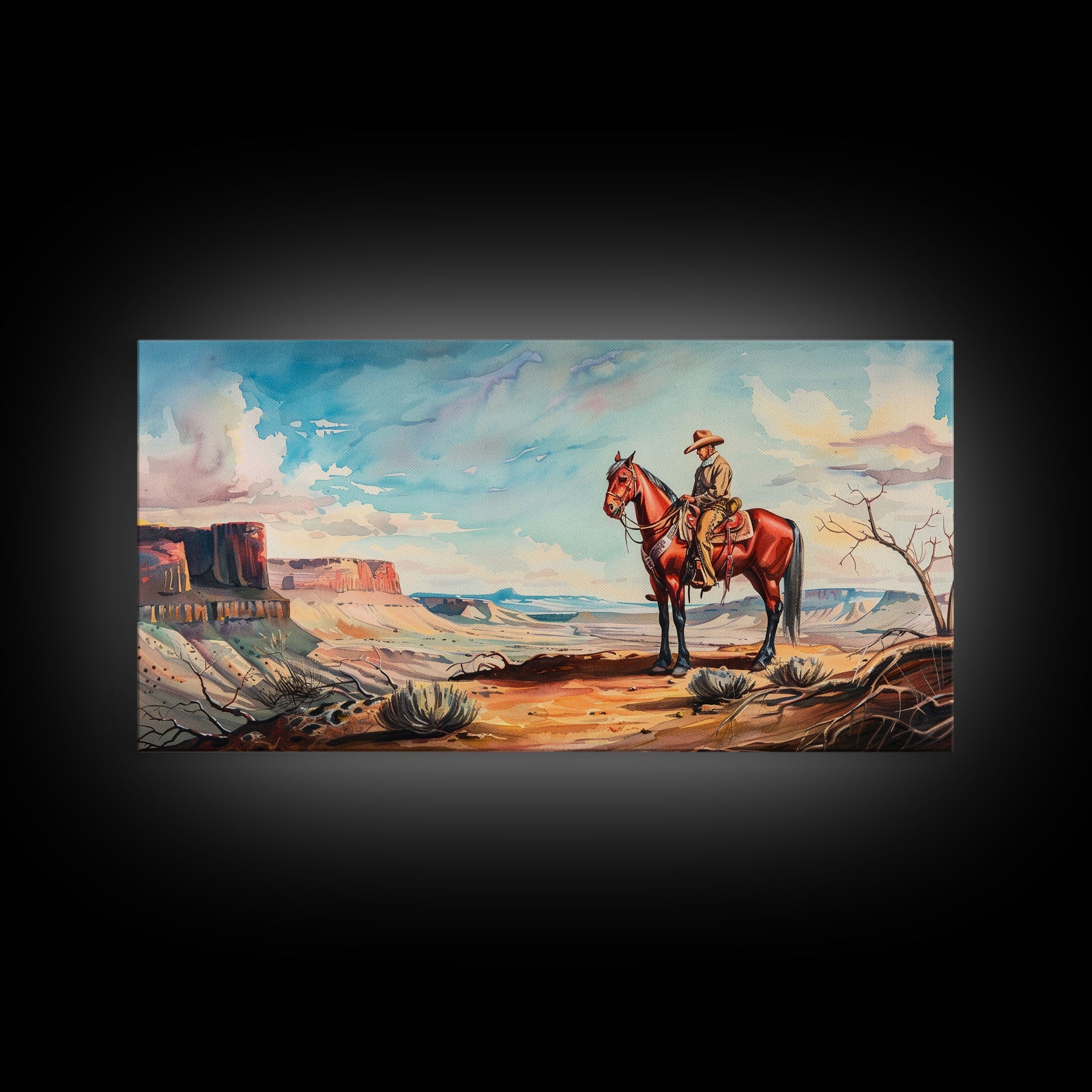 Cowboy on Horse Overlooking Canyon, Majestic Western Art, Framed Canvas Print, Boho Wall Art, Living Room Decor, Home Decoration