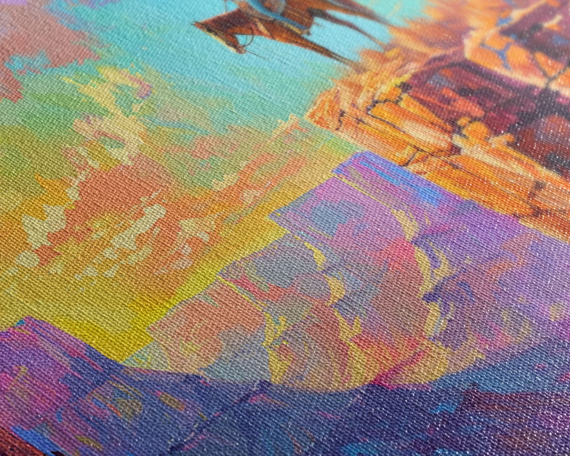 Most of our canvases are made in the USA, with the exception of canvases ordered with the light oak unstained frames, and any large canvases (24x48, 30x60, 16x48 and 20x60) ordered WITH a frame. These are temporarily made in and shipped from Europe, while we try to find a more consistent supplier in the USA.