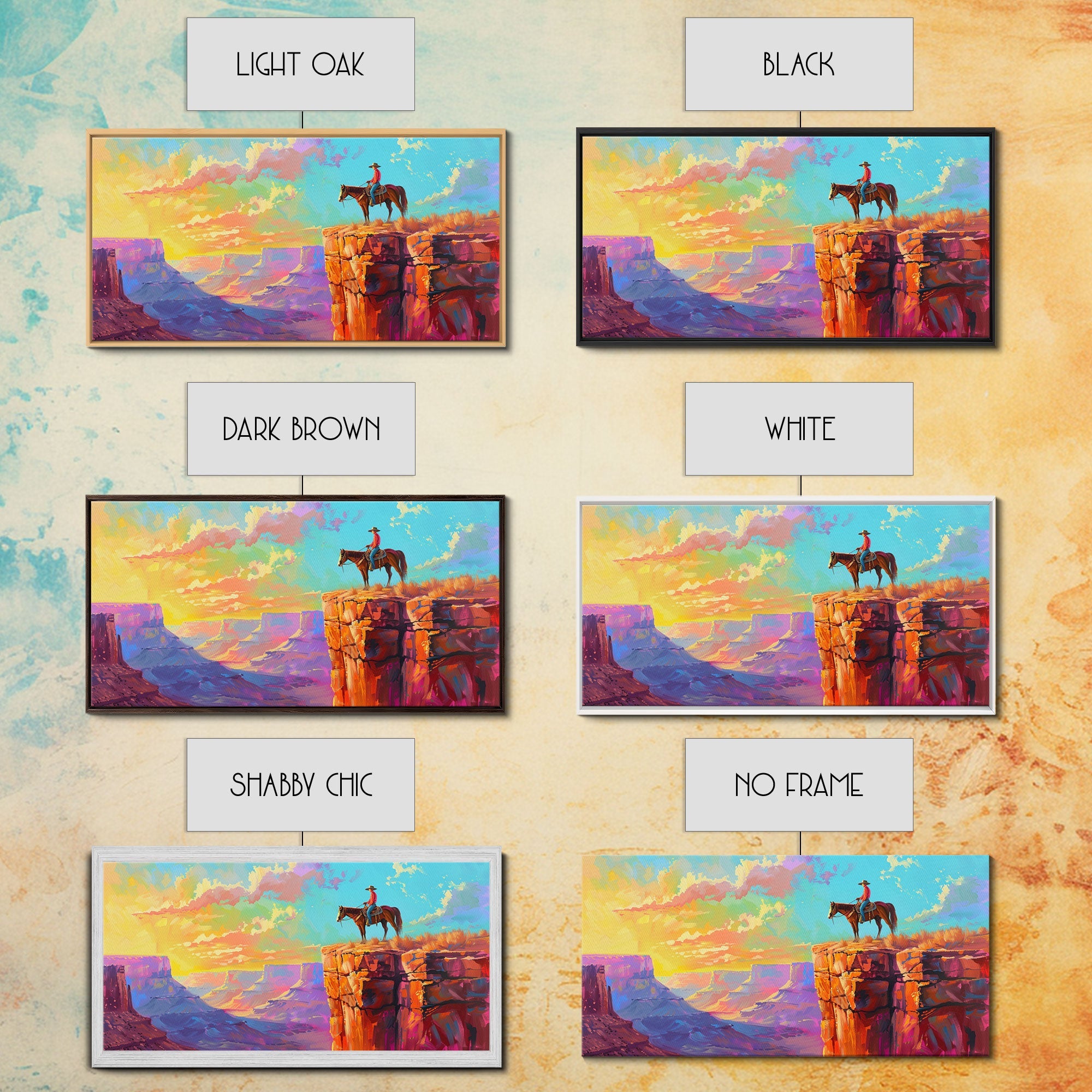 Cowboy on Horse Overlooking Canyon Sunset, Farmhouse Style Framed Canvas Print for Living Room Wall Art, Vibrant Home Decor, Western Scene