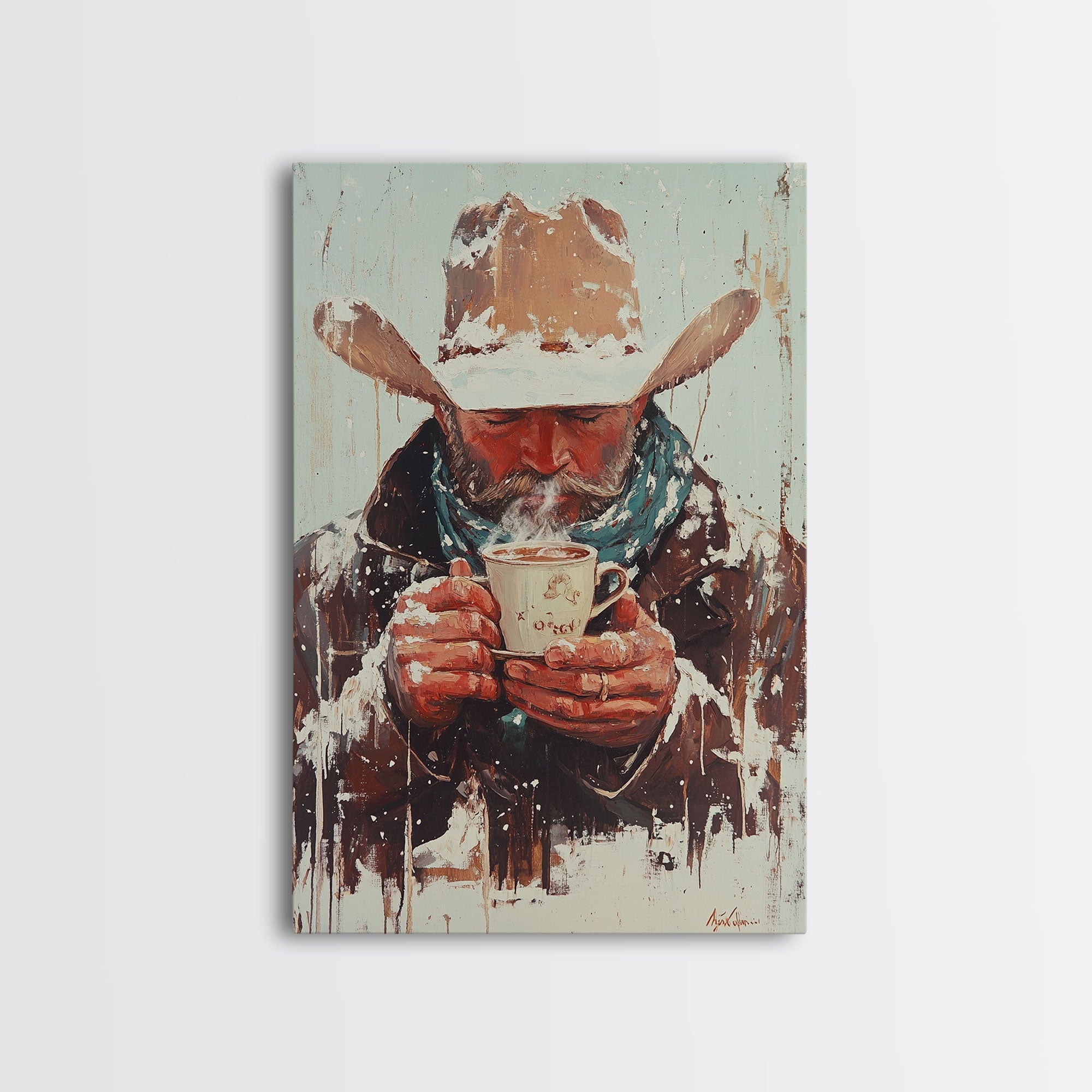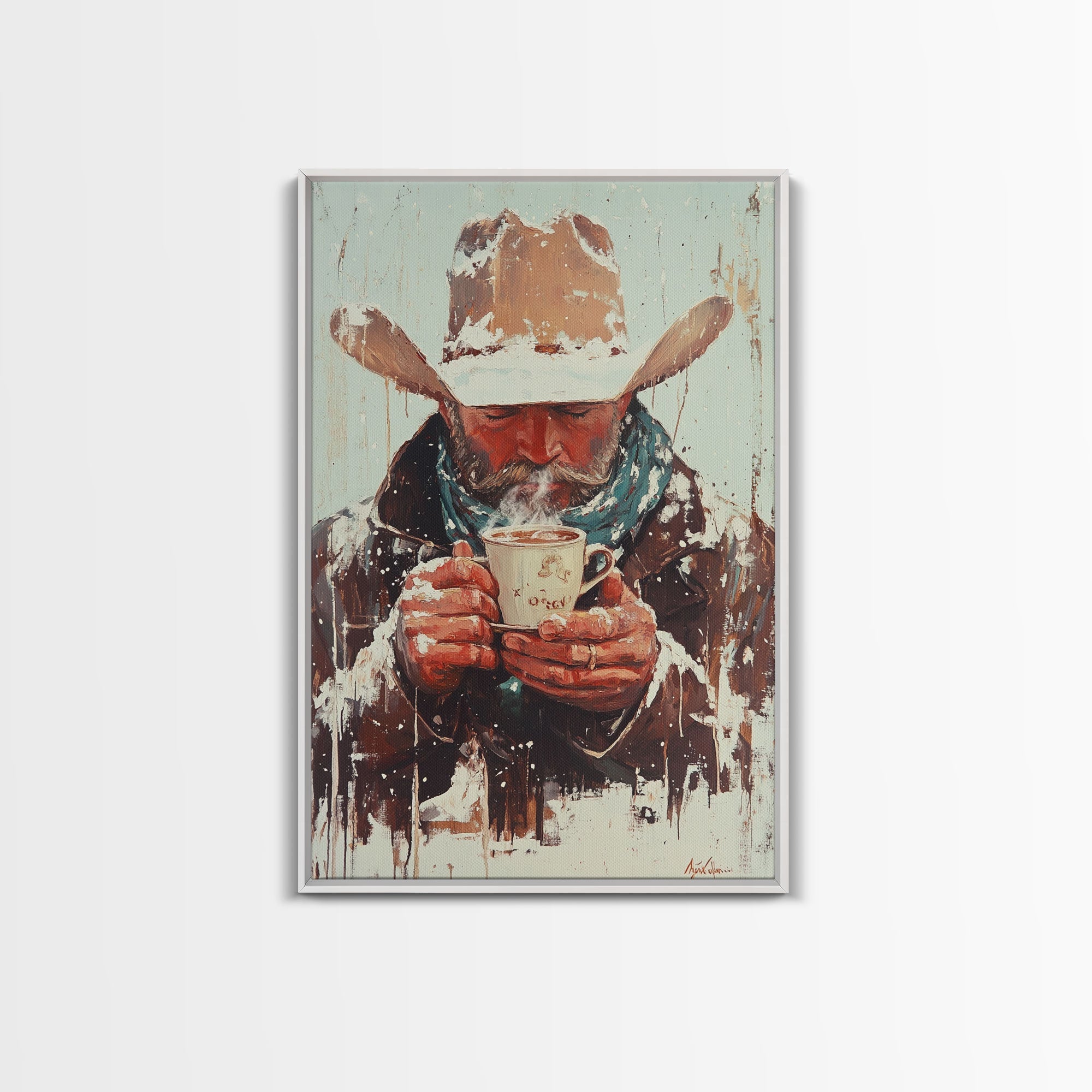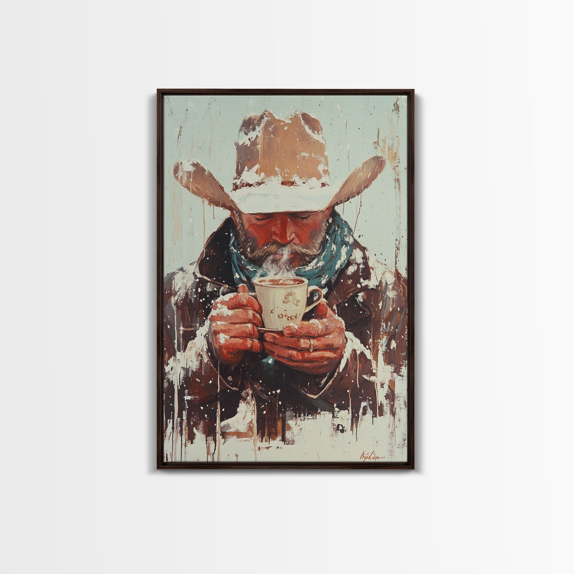 Cowboy Riding Horse in Winter Forest Framed Canvas Print - Moody Winter Landscape Art Perfect 2024 Christmas Home Decor