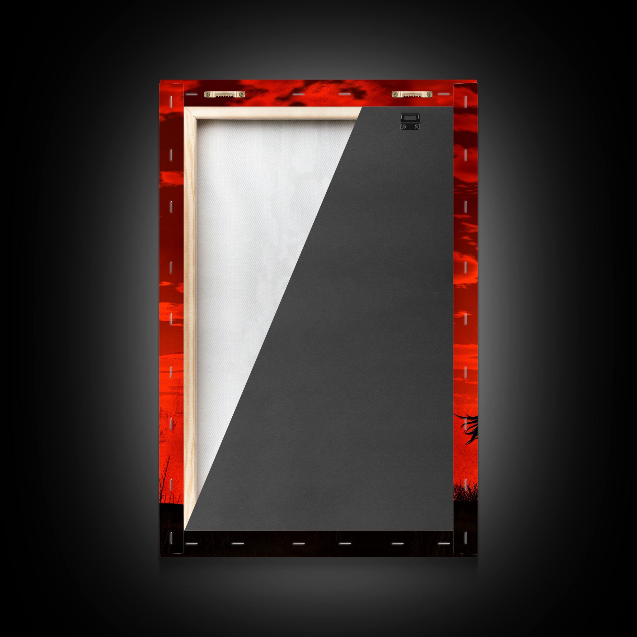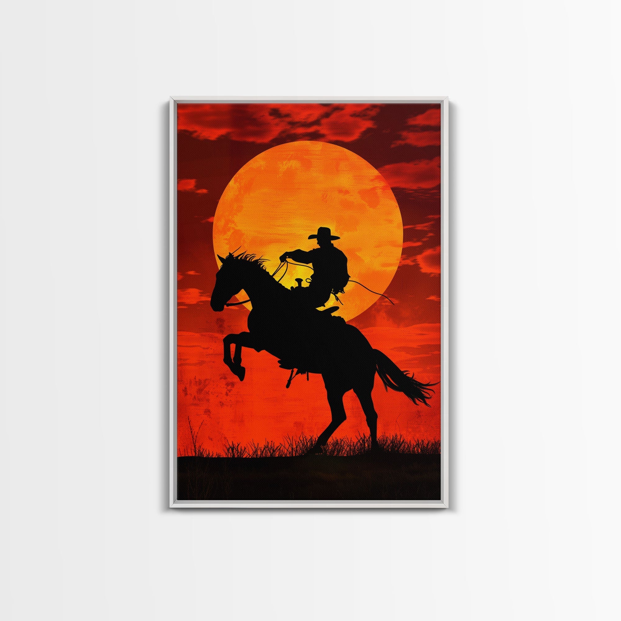 Cowboy Riding Horse into the Sunset | Framed Canvas Print | Western Silhouette Art | Rustic Cowboy Wall Art for Living Room