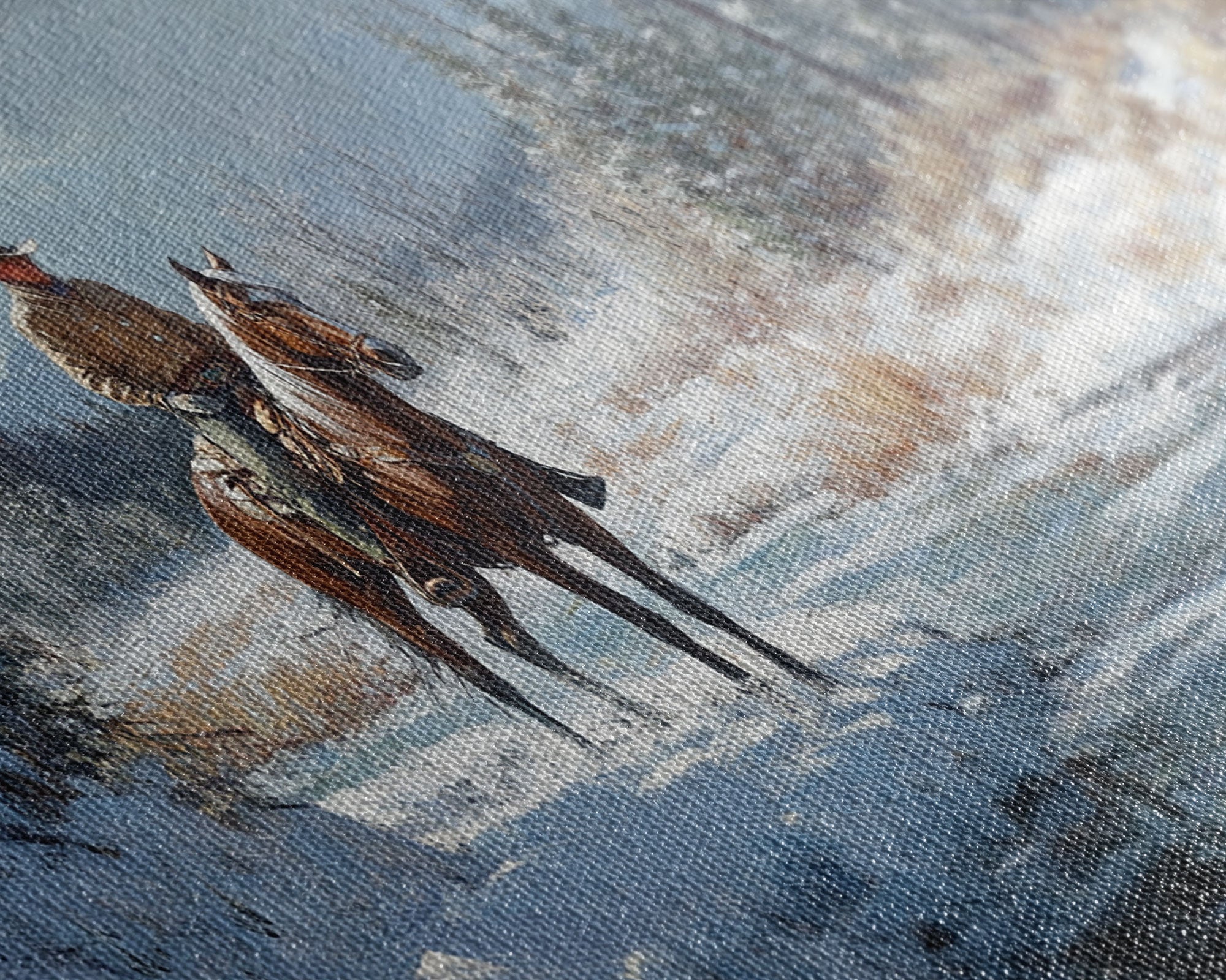 Most of our canvases are made in the USA, with the exception of canvases ordered with the light oak unstained frames, and any large canvases (24x48, 30x60, 16x48 and 20x60) ordered WITH a frame. These are temporarily made in and shipped from Europe, while we try to find a more consistent supplier in the USA.